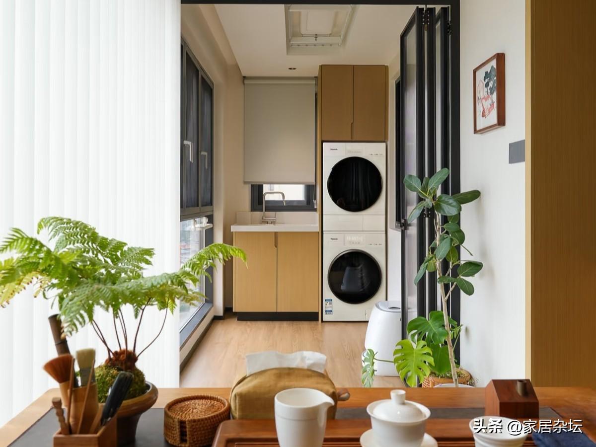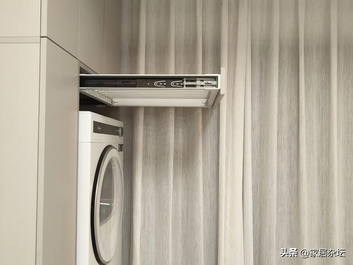 客廳和陽臺打通以後,第一個給大家推薦的方案就是:烘乾機和晾衣區一體化設計。