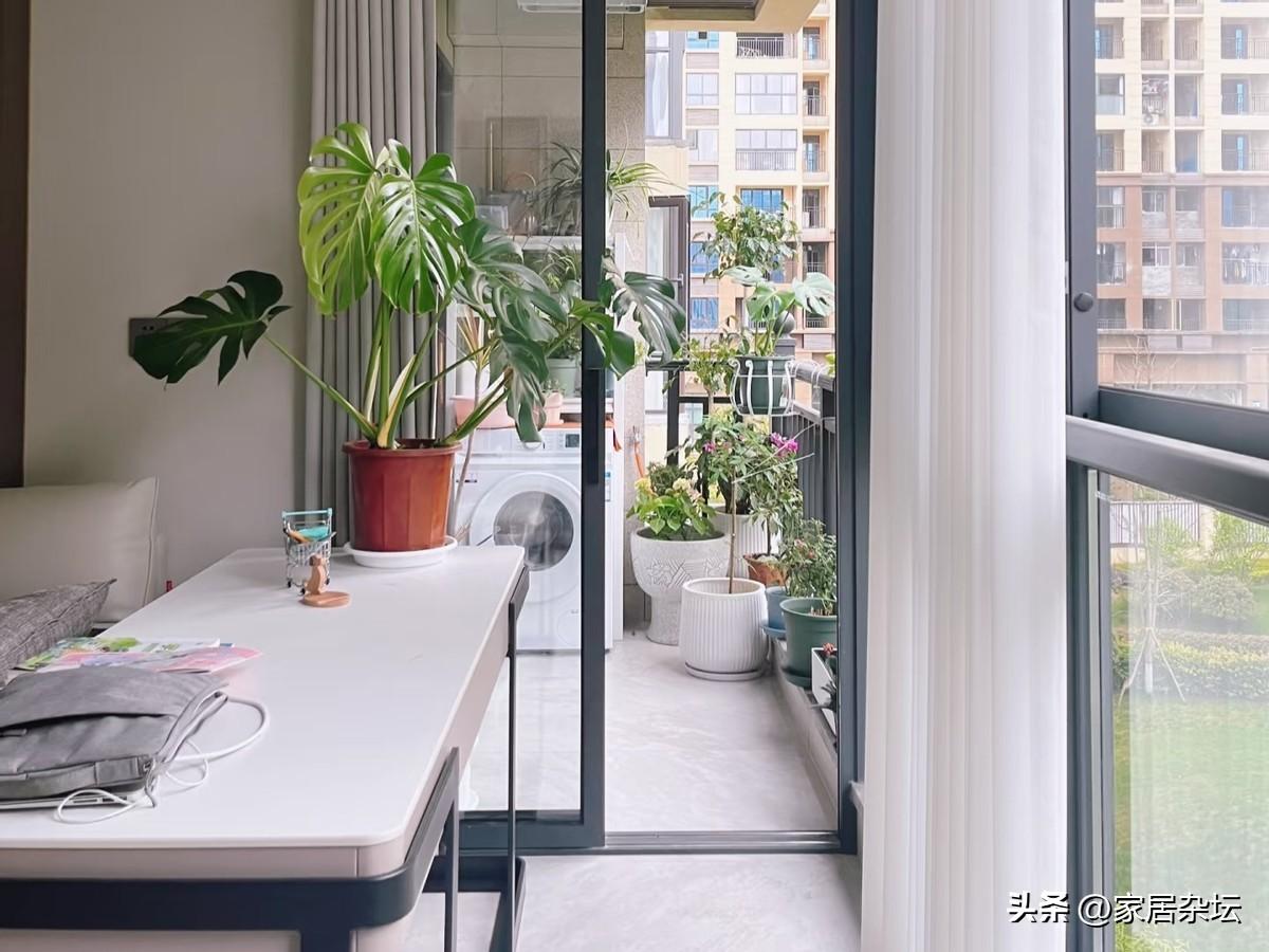 客廳和陽臺打通以後,如果找不到晾衣服,還有另外一種方案:在陽臺打造一個生活角,將陽臺一分爲二。