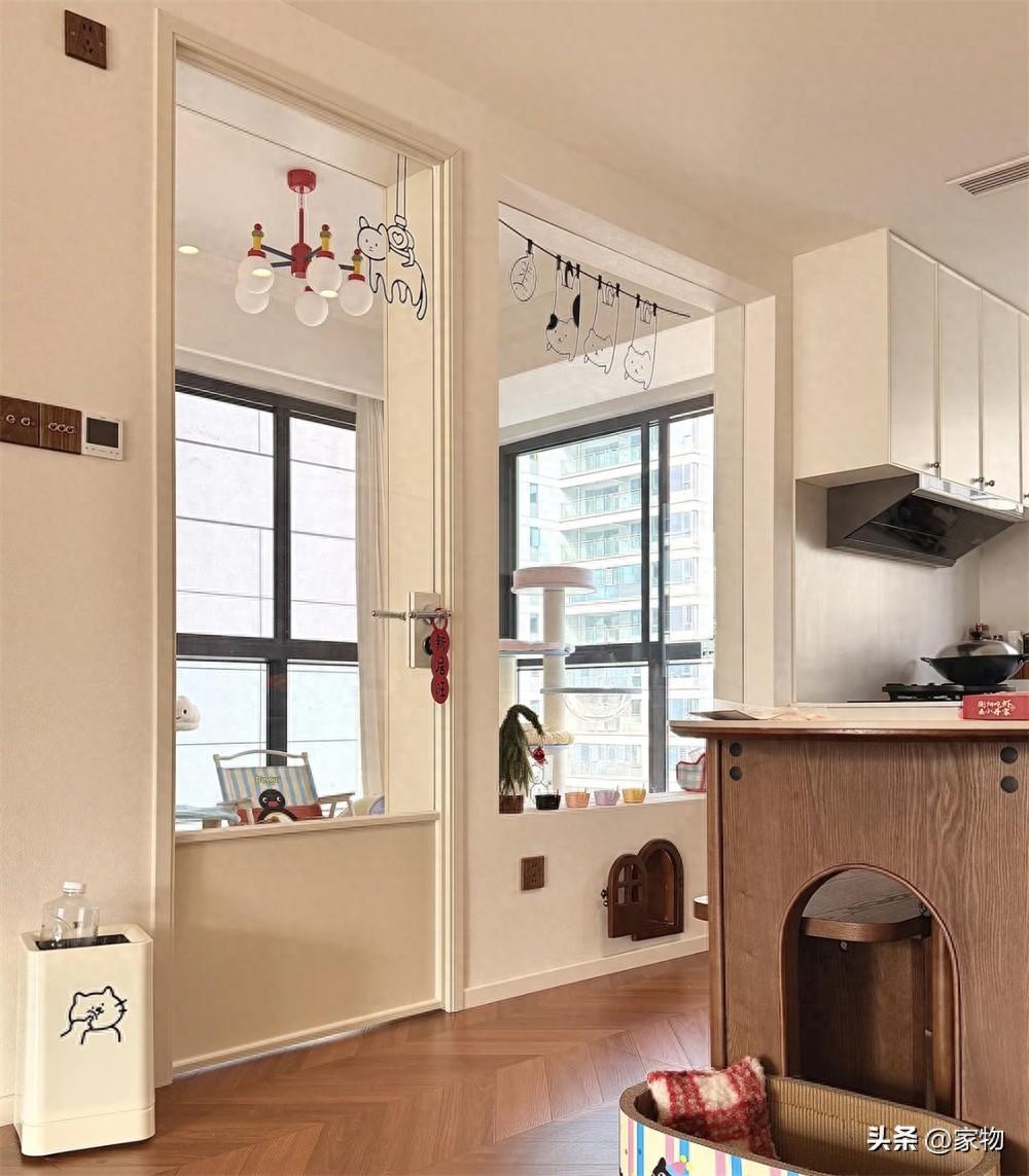 再多說一句,玻璃牆隔斷簡直是點睛之筆,既能觀察到裏面的貓咪,又在視覺上延展了空間,讓貓房內的自然光能照到餐廳和廚房,顯得室內空間通透寬敞了不少。