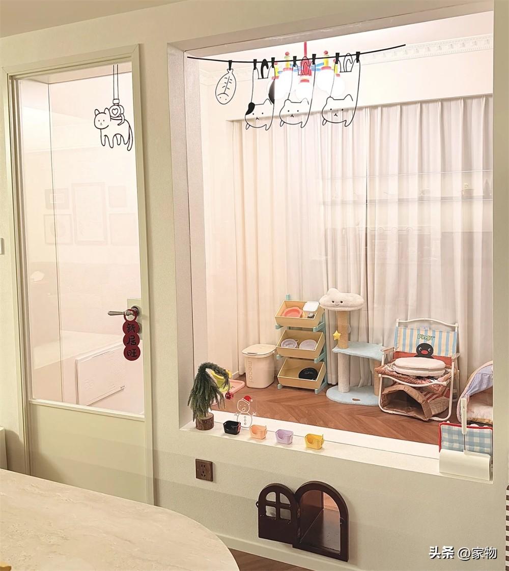 裝修好後的貓房,不僅保留了原本的兩扇大落地窗,還在隔斷處用玻璃門窗代替,可以隨時觀察到裏面貓咪的生活狀態,而底部的小門洞白天都是保持打開的,方便貓咪自由進出,而晚上的時候也能讓它們在裏面安生睡覺,避免拆家跑酷,可以說是一舉多得了。