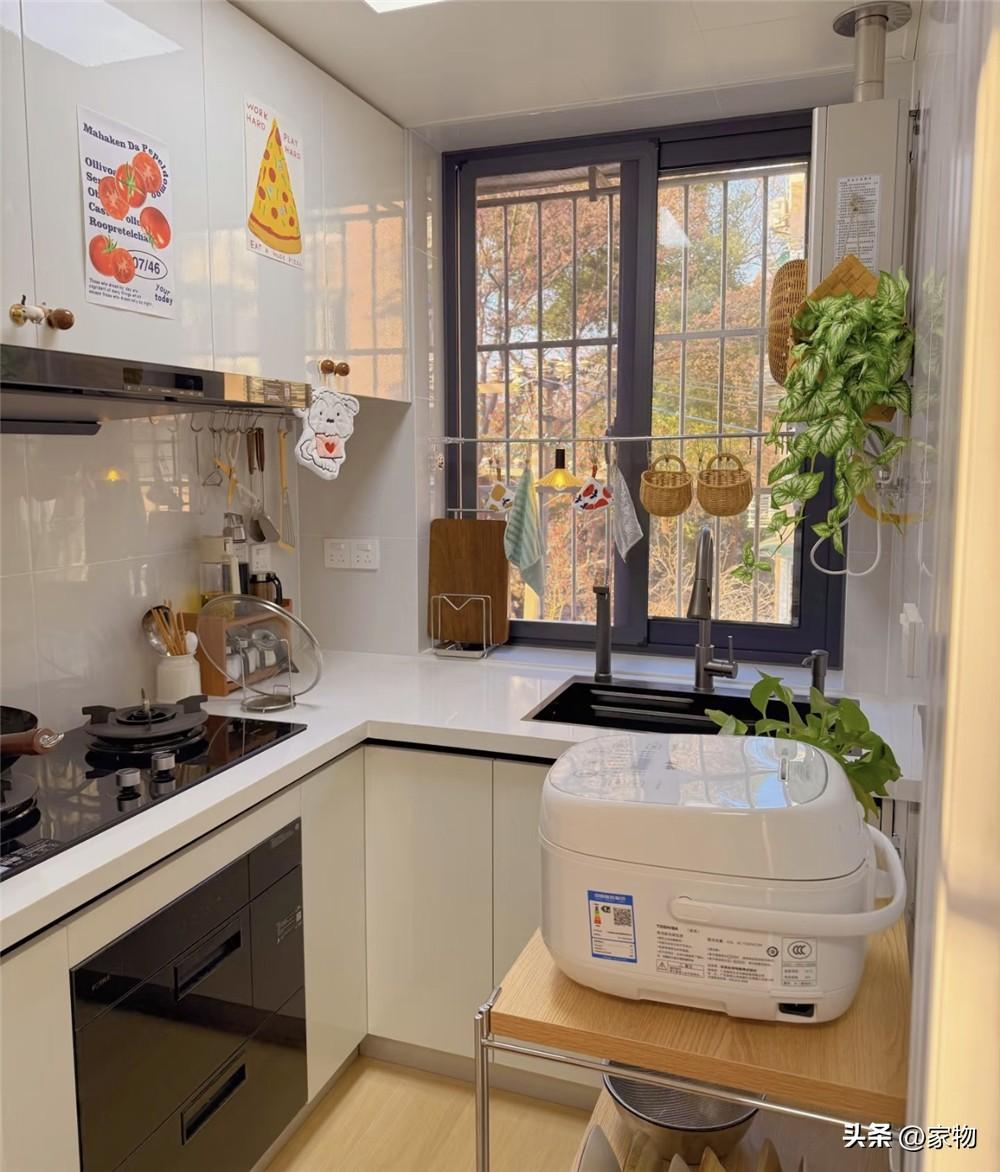 廚房差不多有3㎡左右,搭配一個放廚電的收納架,變成了U形格局,各種廚電廚具嵌入櫃子裏,檯面轉角處也留出了一個小小的切菜備菜空間,雖然很緊湊,但一間廚房該有的功能它倒是也都有。