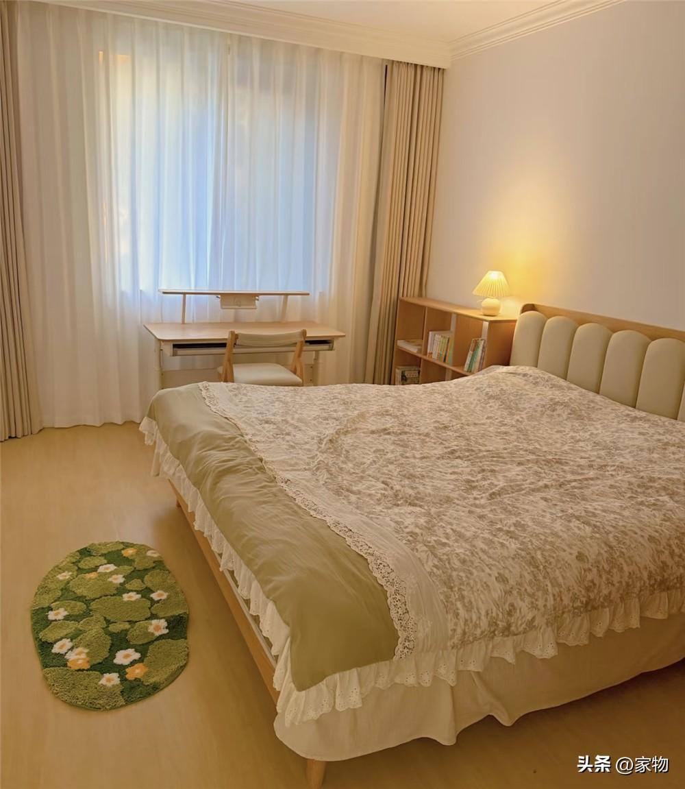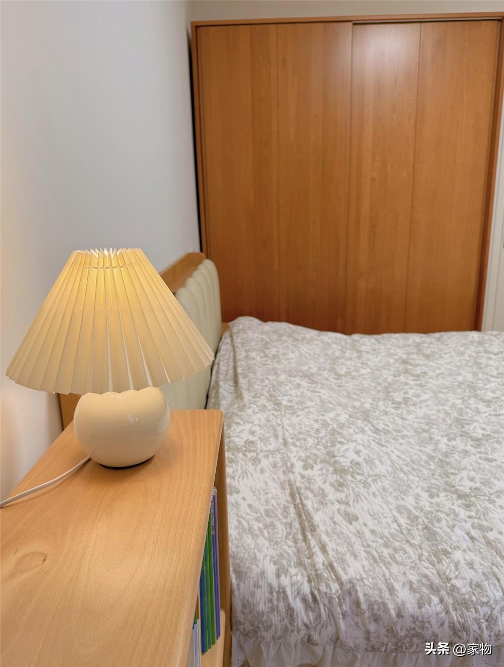 最後就是家裏的主臥室啦,一張1米8的超大雙人牀放在中間位置,兩個人躺也不覺得擠,靠窗的位置放書桌,旁邊用半身矮架代替牀頭櫃,既能收納又能放閱讀燈,一物兩用更加節省空間。