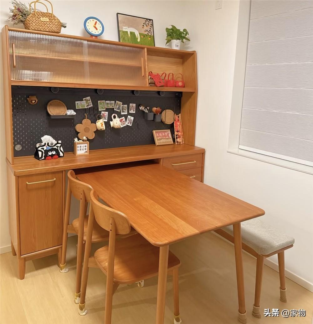 但話又說回來,畢竟家裏空間較小,想要放上一張哪怕是一米六的餐桌也很勉強,只好利用餐邊櫃內收的設計,在平時將桌面塞入餐邊櫃底部進行收納,日常一家三口吃飯空間足夠,家裏來人做客抽出來也能坐下更多的人。