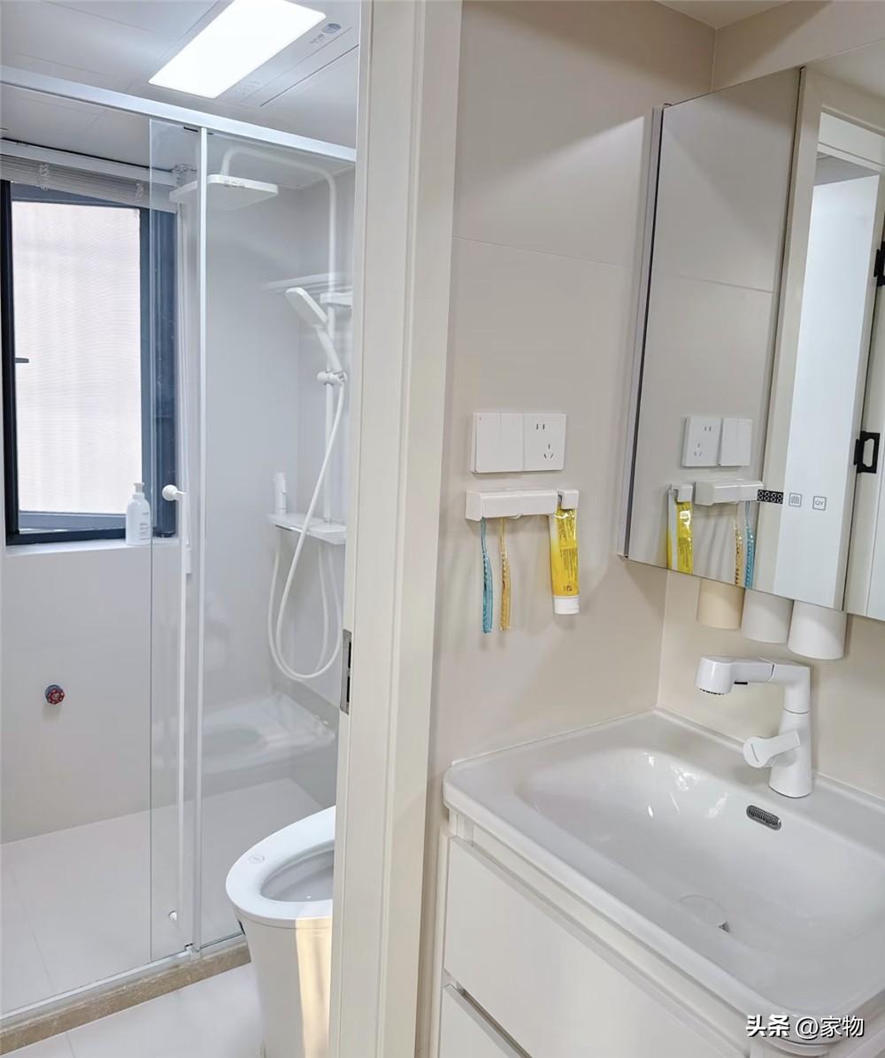 之所以要將洗手檯外移,主要也是因爲衛生間內實在太小,想做浴室的話只好如此,說起來也算是半個“三分離”式格局了,洗漱如廁沐浴互不打擾,一家三口生活的話,用起來真的非常舒適。