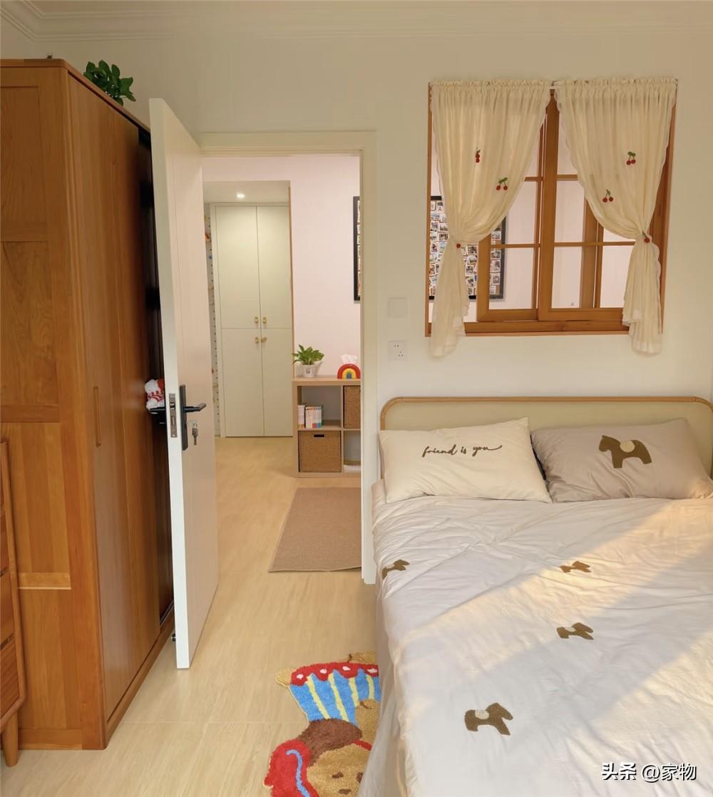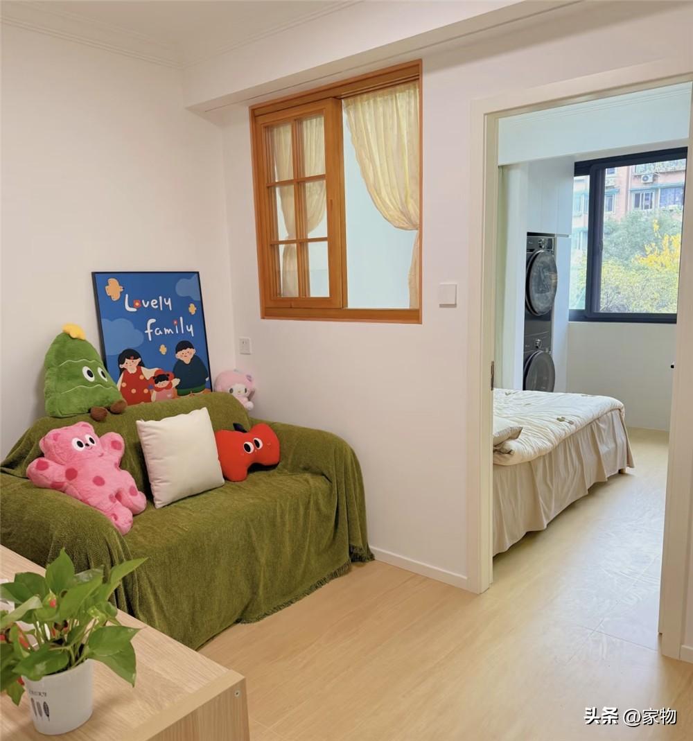 牀頭和客廳中間的隔斷牆上,掏出了一個方形的內窗,一方面,它可以避免影響光線和空間通透感,另一方面,也算是增加了額外的採光和通風性,哦對還有,讓次臥室顯得多了幾分田園氣息。