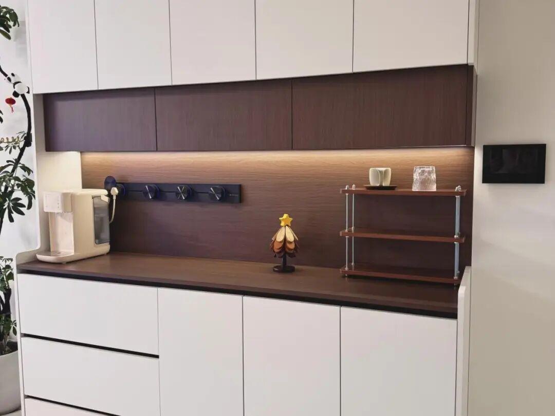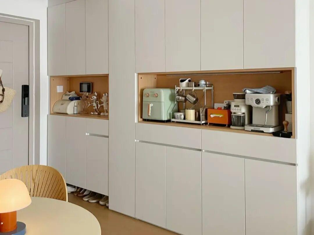 裝修的時候,在櫃體背板或者是側板開孔,預留插座通道,像餐邊櫃至少留2~3個帶開關的插座。