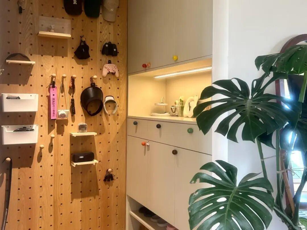 過渡區也儘量分層設計。像玄關櫃中段留空40釐米高,檯面放隨手物品。下方懸空可以放常穿的鞋,內部是掛鉤,用來掛外套、包包。