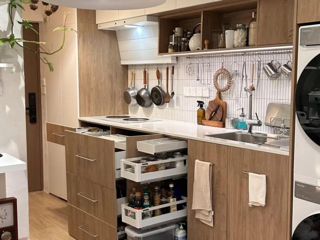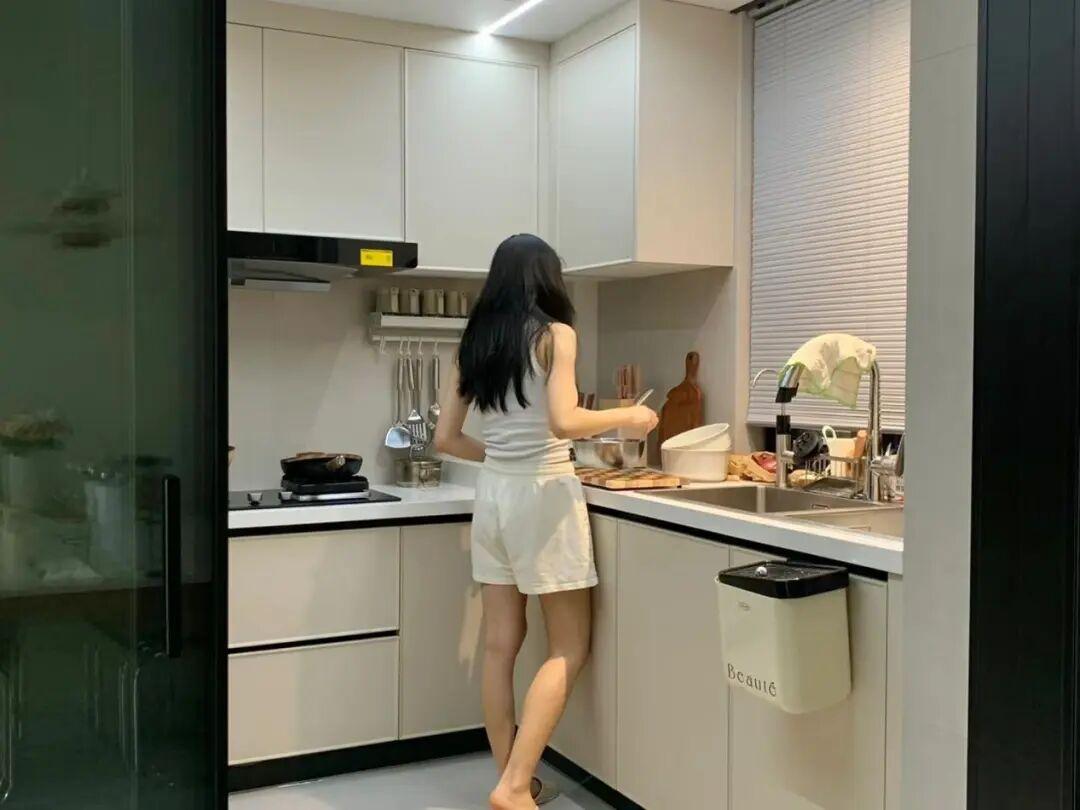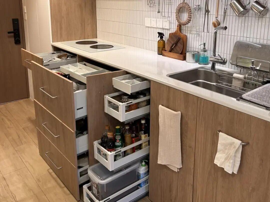 設計細節要注意。可以在廚房吊櫃做下拉籃,地櫃多用抽屜不用隔板,可以減少彎腰幅度,增加收納。