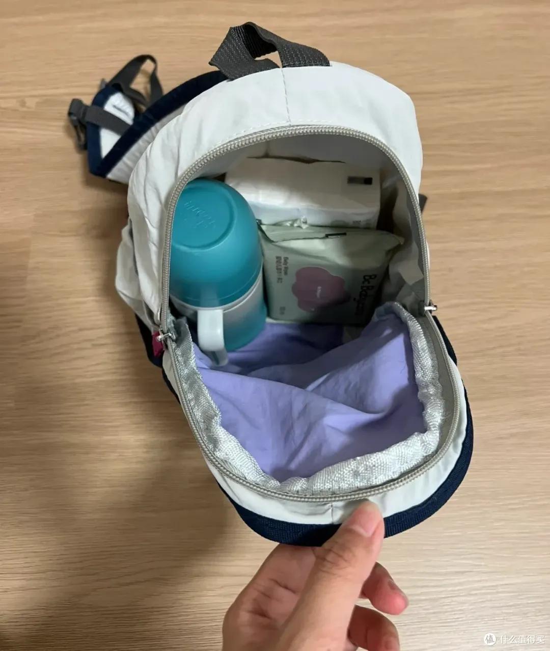 除了輕便,它的容量也挺大,像奶瓶、溼巾、替換衣物這些小件,基本都能一包搞定。