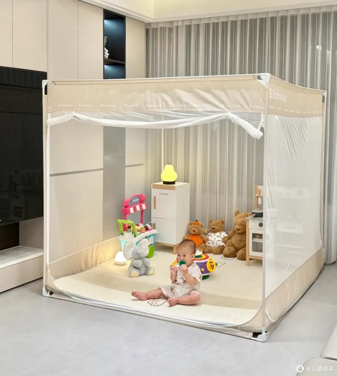 而防摔蚊帳是全包圍的“穹頂式”設計,和牀墊無縫拼接,整體形成一個柔軟又結實的保護罩,寶寶在裏面隨便蹬、隨便踹,手腳都不會被卡住,翻滾也有彈性網兜着。