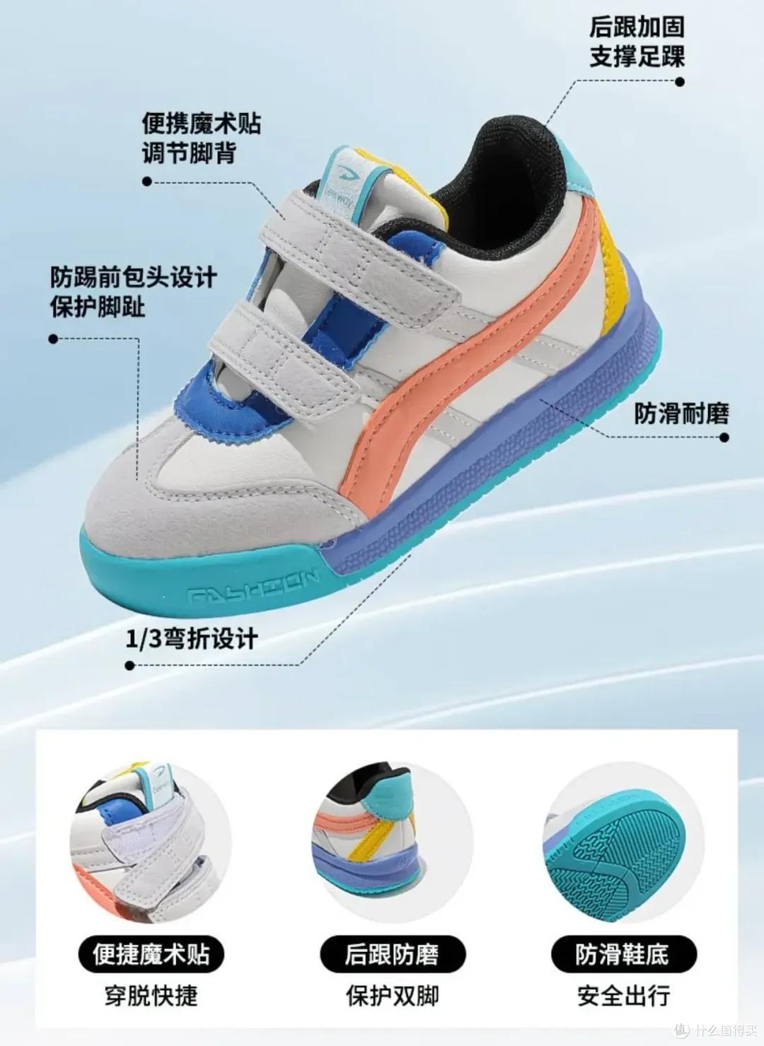仔細看細節,它有防踢前包頭+後跟加固,保護周全又耐造;魔術貼是童鞋的標配了,穿脫方便,隨時調節;還是寬鞋頭,腳趾活動空間大,不擠腳,才能撒開了跑。