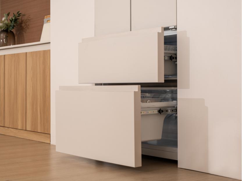 更貼心的是90°直角開門設計!哪怕冰箱緊貼牆面擺放,門體打開90°時,內部抽屜也能完全拉出,取深處的食材不用費勁摳,小戶型廚房也能輕鬆駕馭。而且它有十字門和法式門兩種選擇,我個人傾向於法式門,線條更柔和,跟開放式廚房超搭。