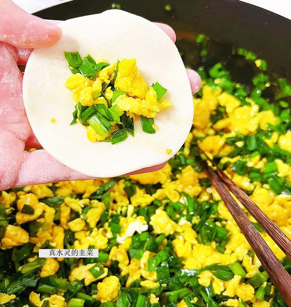 我通常用韭菜配雞蛋和蝦皮,做成經典的三鮮餡。韭菜的香氣和雞蛋的鮮嫩相得益彰,蝦皮增加鹹鮮味。