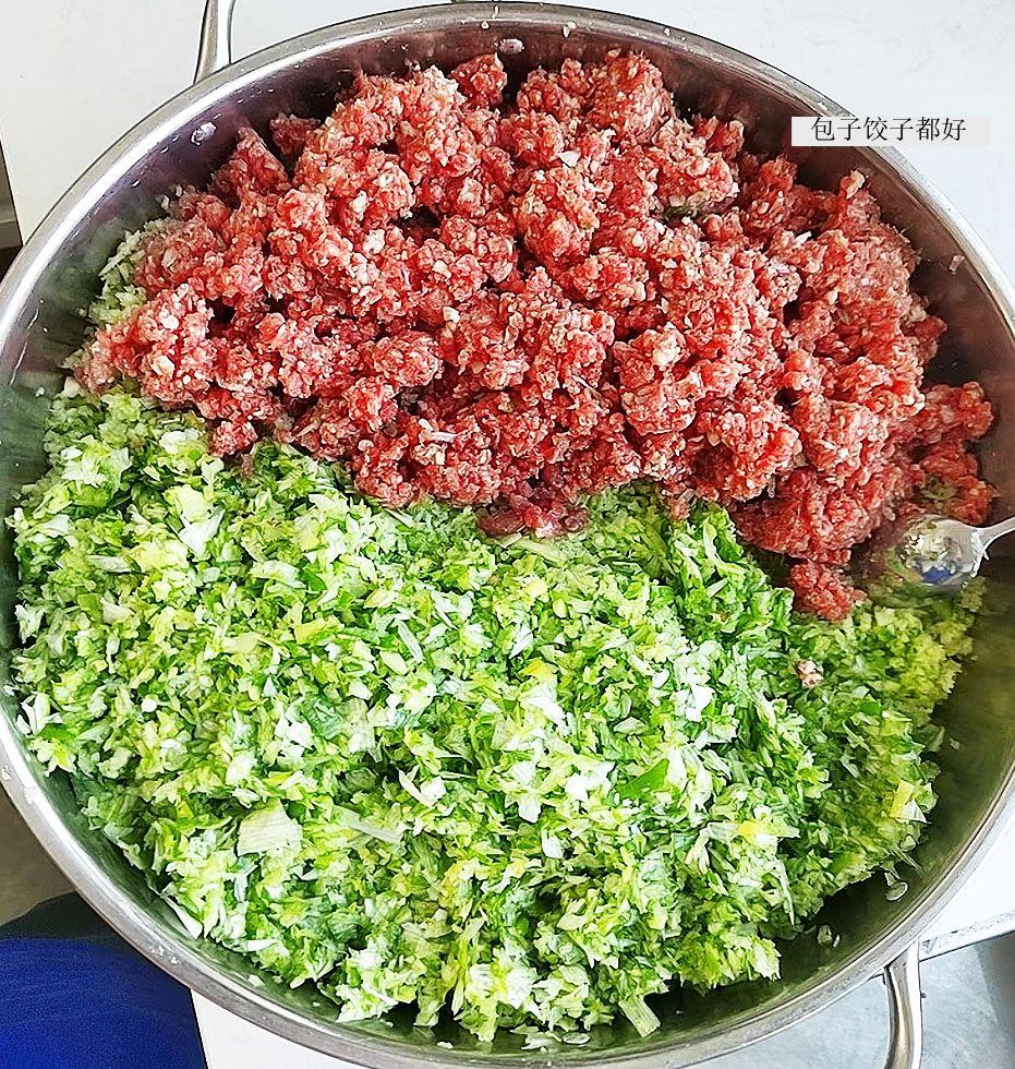 肉餡里加大量的小蔥,既能去腥增香,又能讓餡料更加多汁。