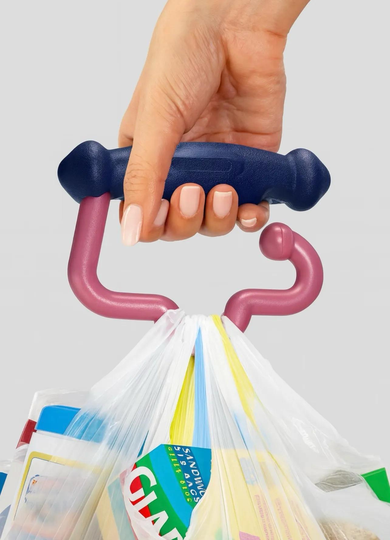 網上有種提重物神器,原理就是把勒手的細繩子,轉換成大面積分力的握柄。