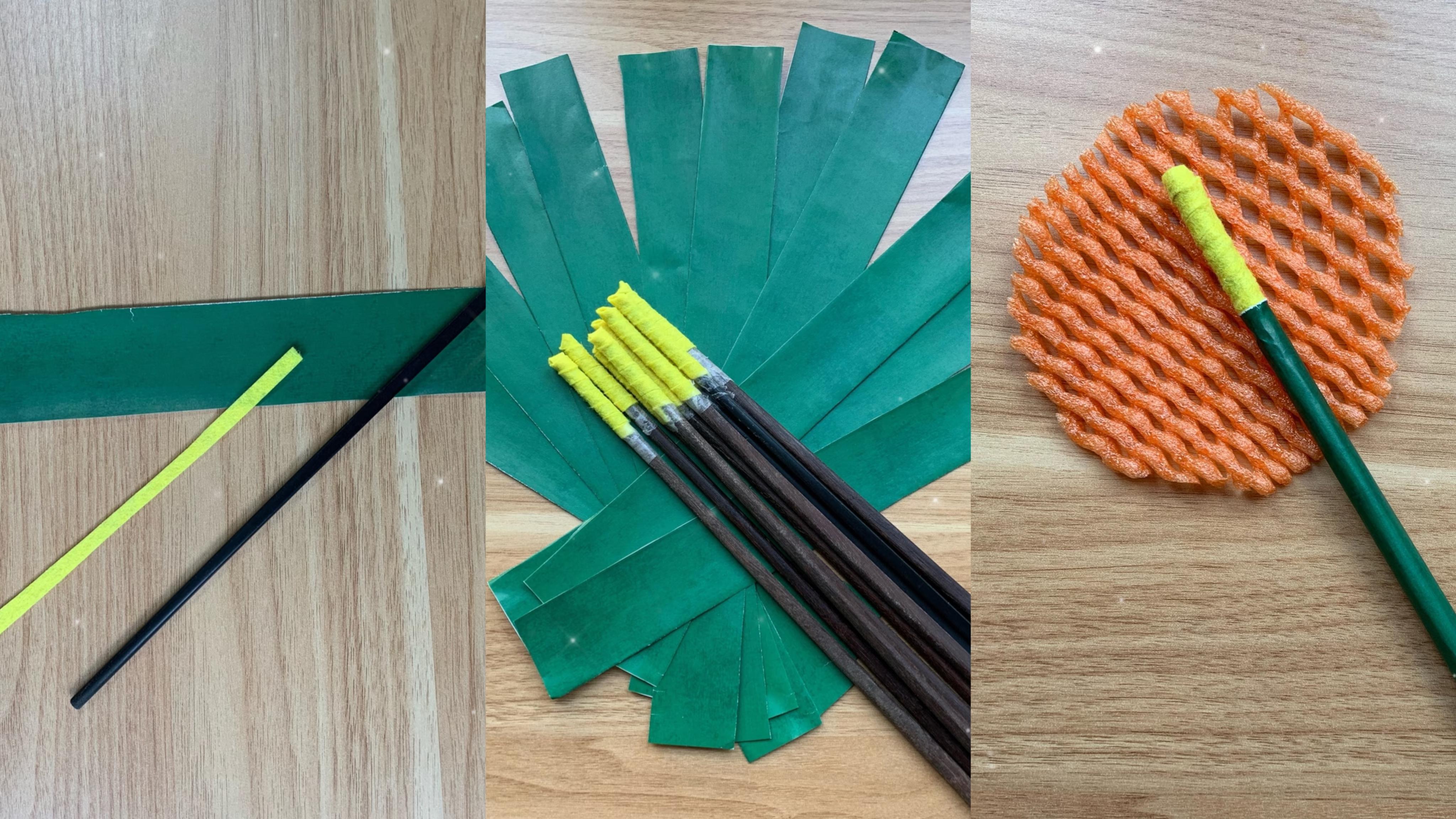 - 在筷子前端裹上雙面膠,再纏上一層無紡布,筷子後段用彩紙裹上;