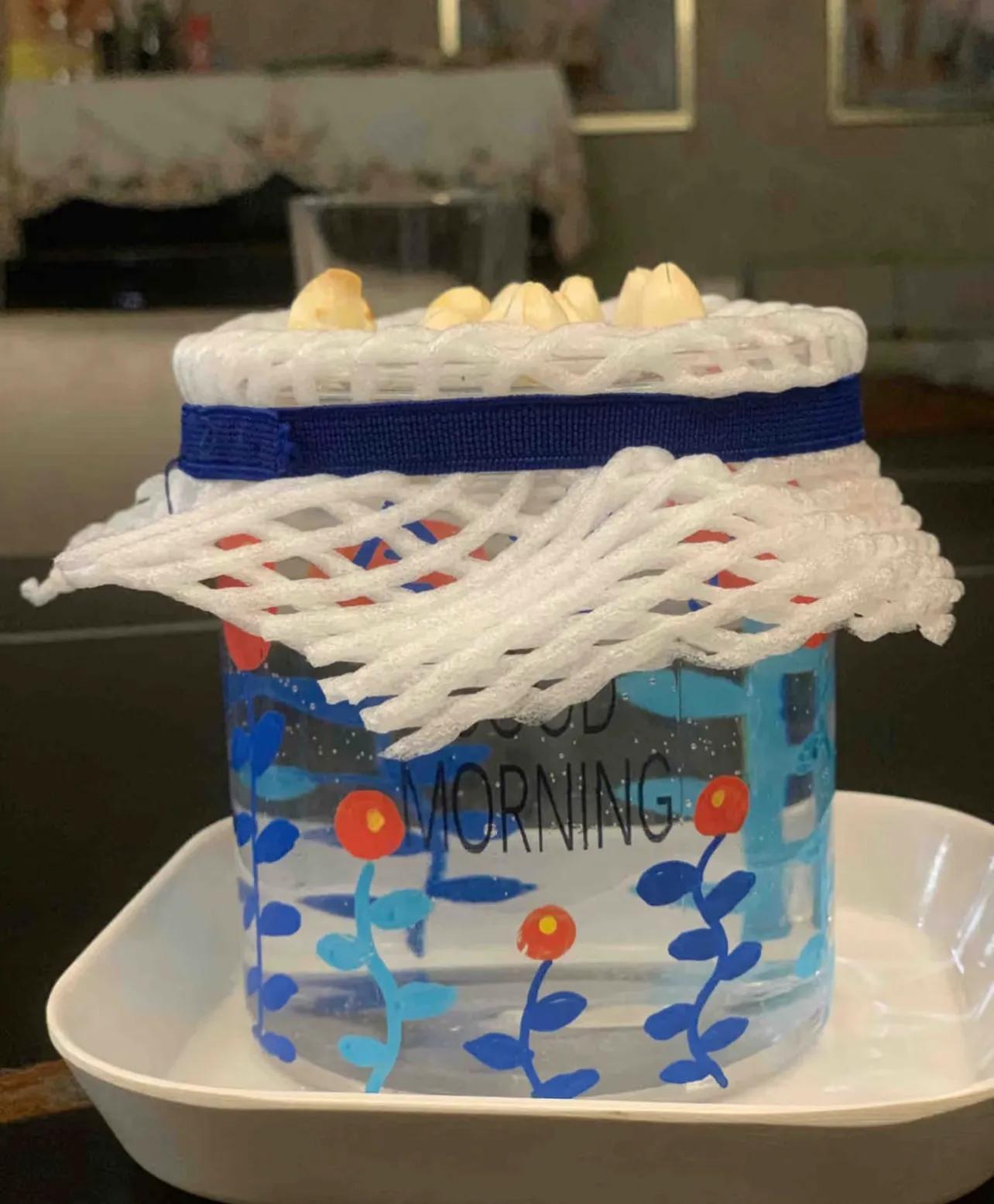 ③再把泡沫網綁在容器口,將發了根的種子放在網上,根鬚會自己鑽下去吸水,每天看看水位,別讓根幹着。