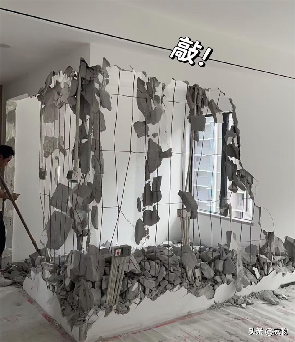 檢查過建築圖紙並且問過物業後,得知這面牆有一大半都可以完全拆除掉,於是便開始了她的裝修改造(裏面的鐵絲相當於是砌牆的掛網固定,並非承重)。