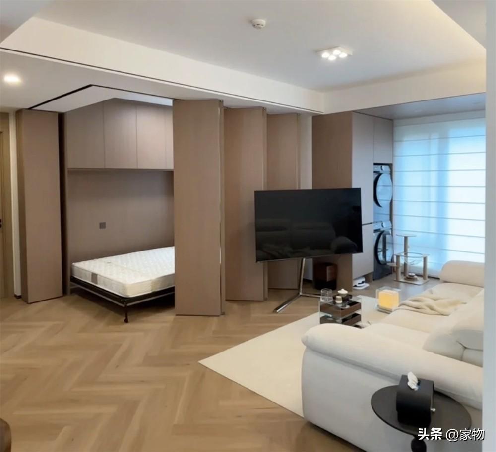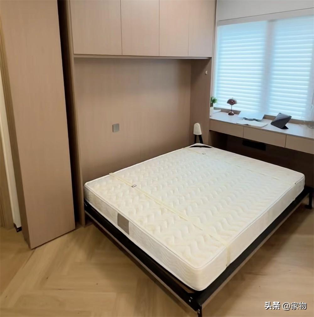 她採用了墨菲牀的設計,將一張1米6的雙人牀摺疊在了櫃子裏,平日裏收起來一點也看不出來,就像個背景板。