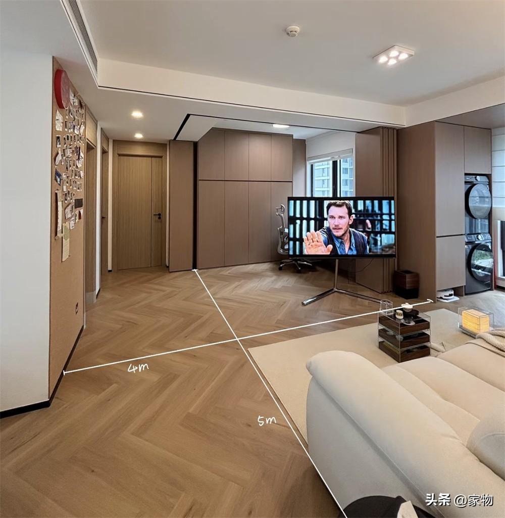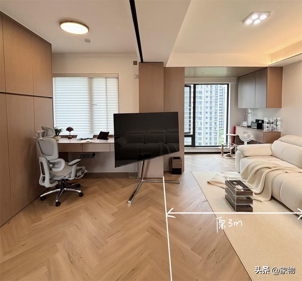 將這次臥室的牆面拆除後,客廳面前一下子沒了遮擋,客廳、陽臺、次臥室相連,變成了一個超大號的空間,雖說電視牆沒了,但完全可以用支架電視代替,不僅顯得簡潔乾淨,還更加靈活,方便旋轉視角和移動。