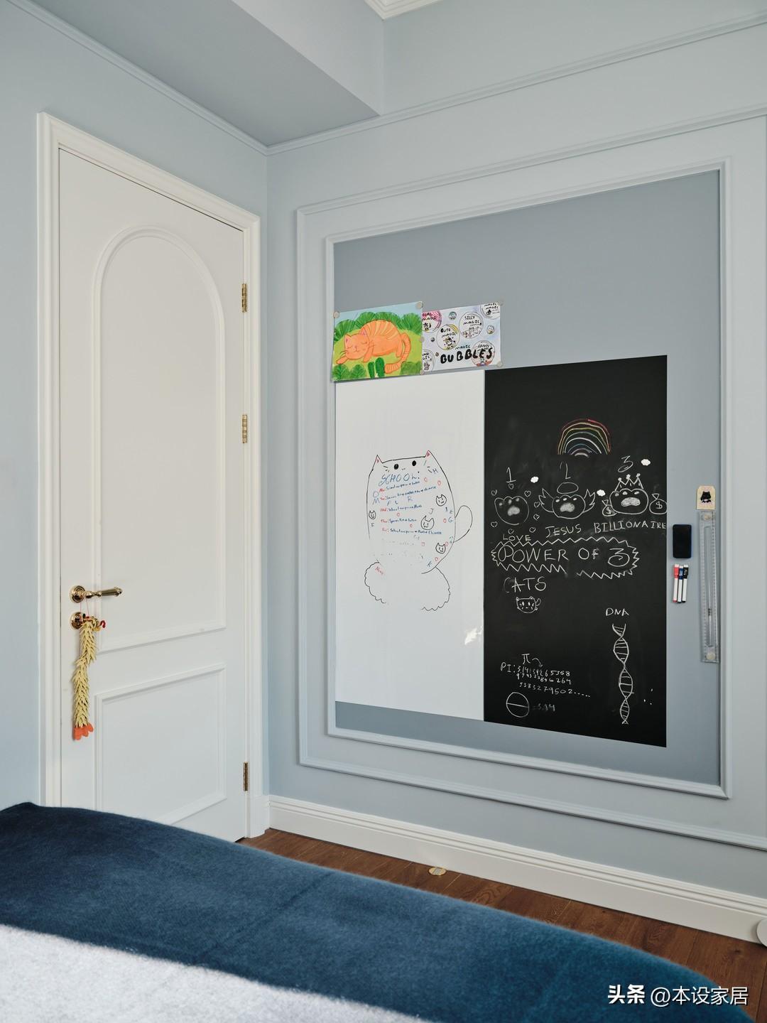 而門口的牆面還設計了一塊可擦洗的磁性黑板漆,盡情發揮塗鴉,以靈活姿態陪伴成長的每一步。