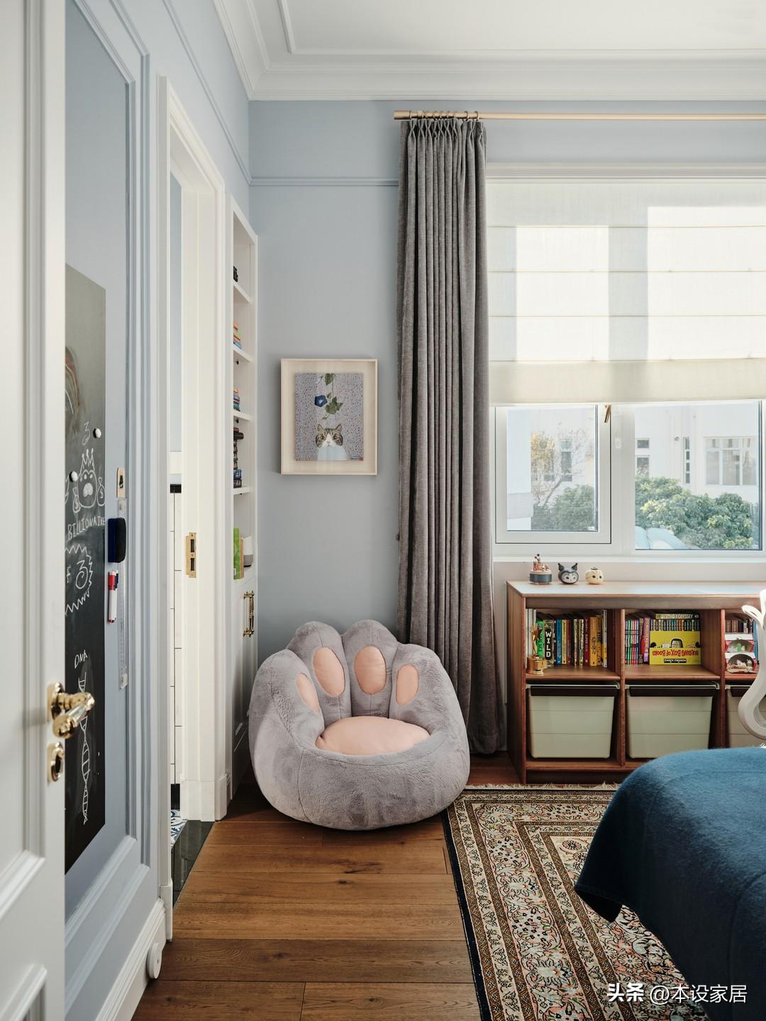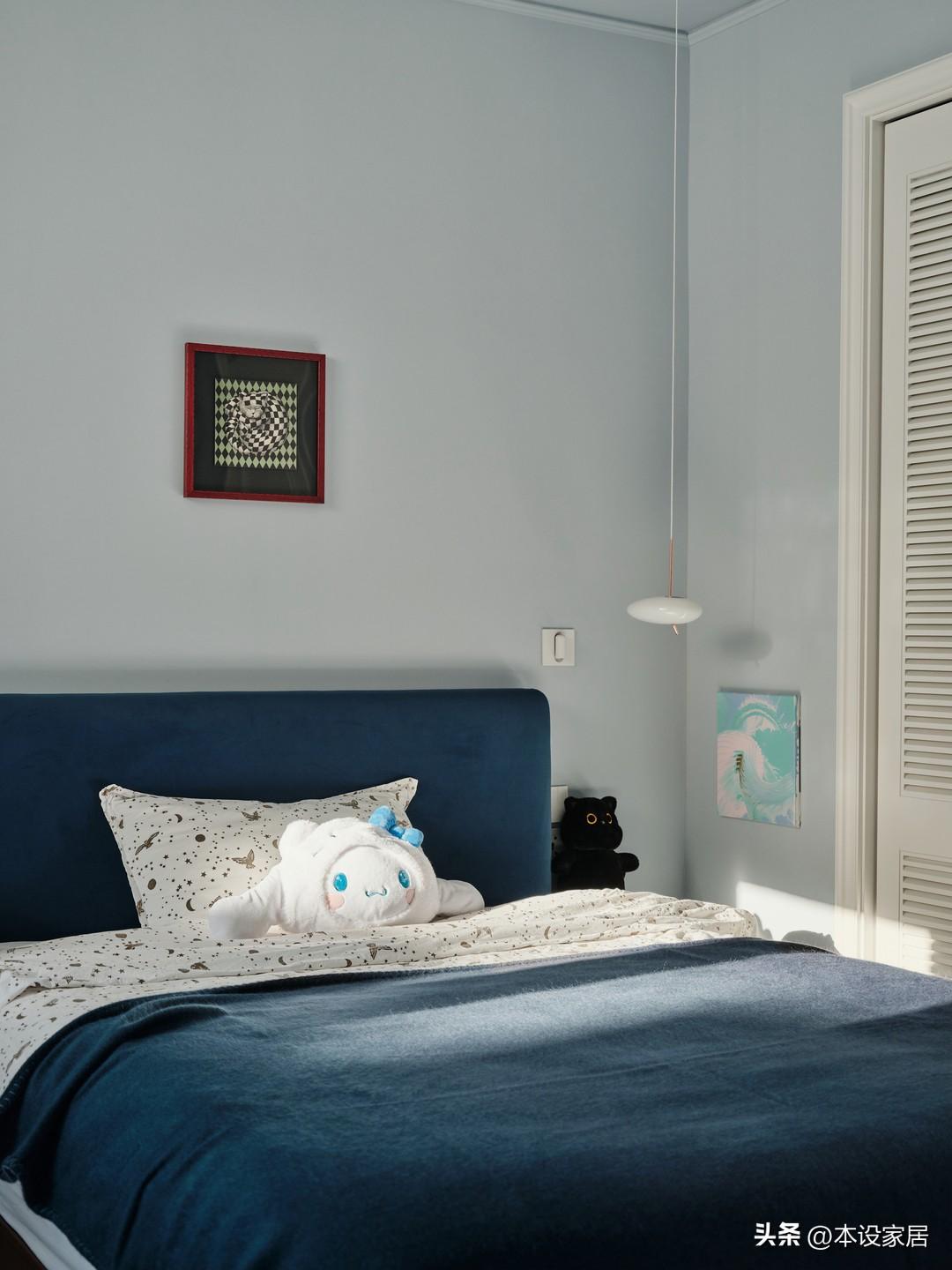 兒童房的牆面刷淺藍色漆,搭配藍色系列的牀品,營造出一個寧靜的休憩氛圍。