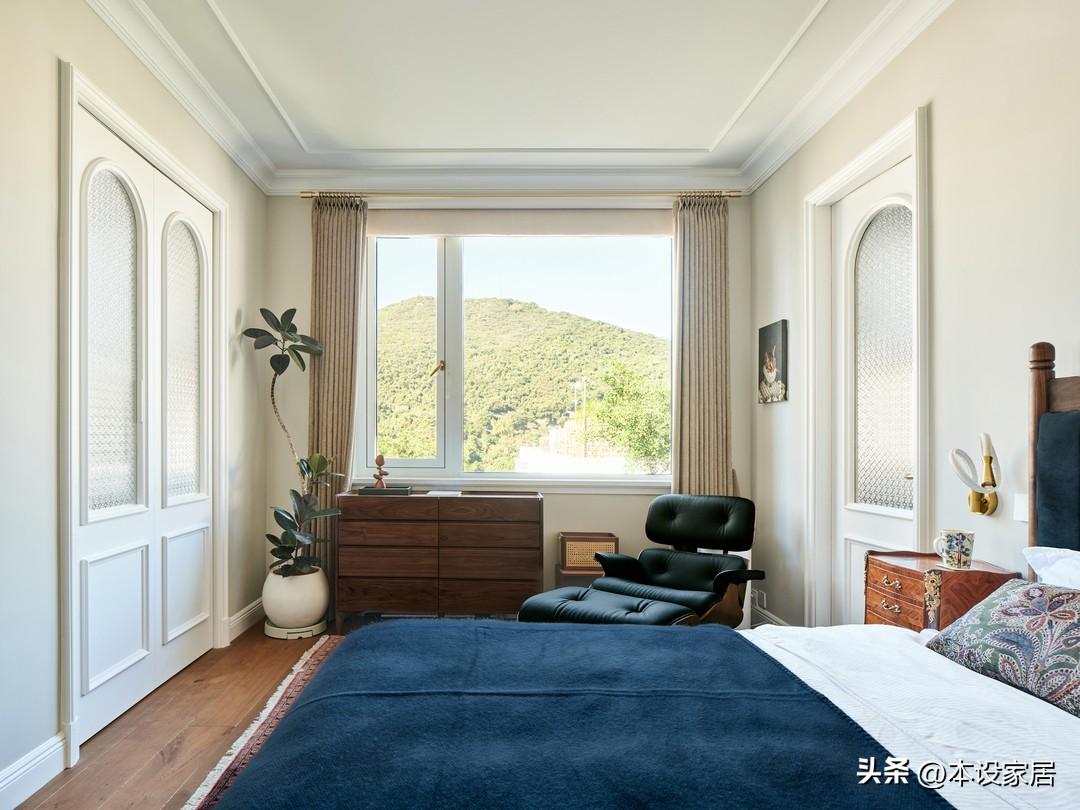 主臥延續了整體法式的格調,在這個空間裏,每一處細節都透露着法式古典的韻味,牆壁大面積是典雅的奶油色漆,搭配着精緻的石膏線條,並且延伸到吊頂,一氣呵成。