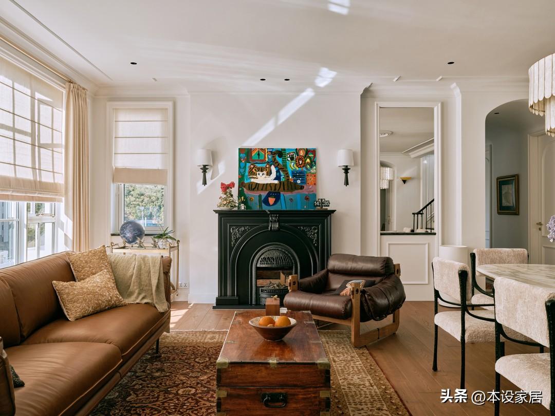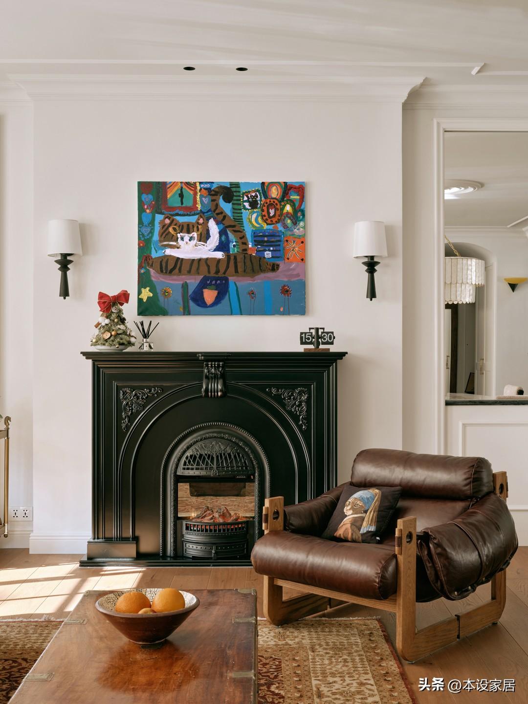 另一邊是鏡面、壁爐、方形窗與之形成對稱,黑色的鑄鐵裝飾壁爐是根據空間比例量身定製,不論是選材還是尺寸,都彰顯出一種莊重的氣質和溫馨的生活感!