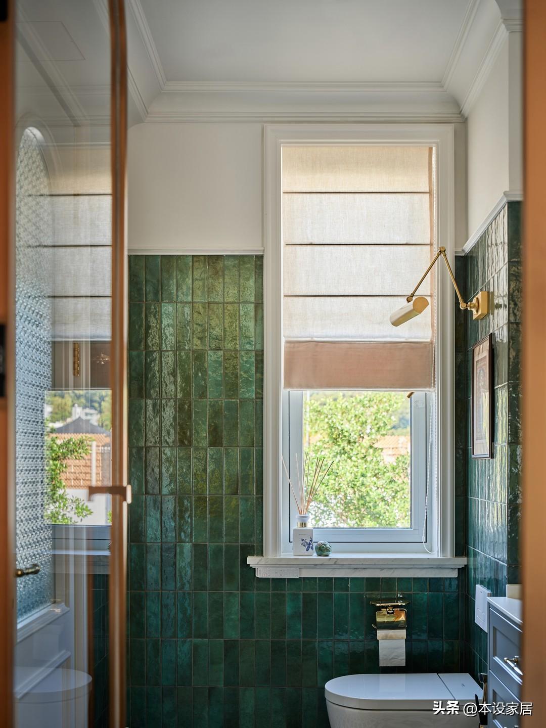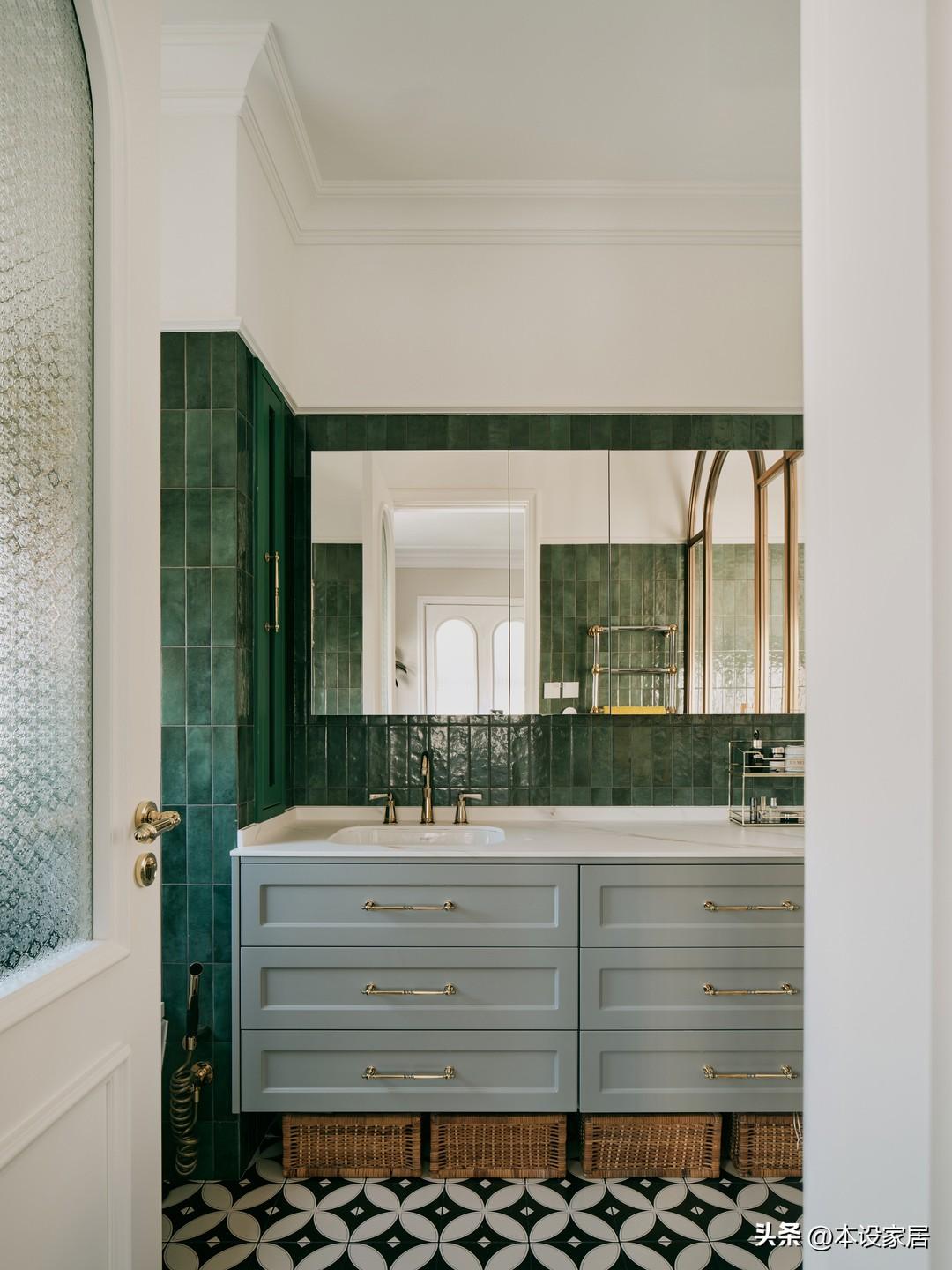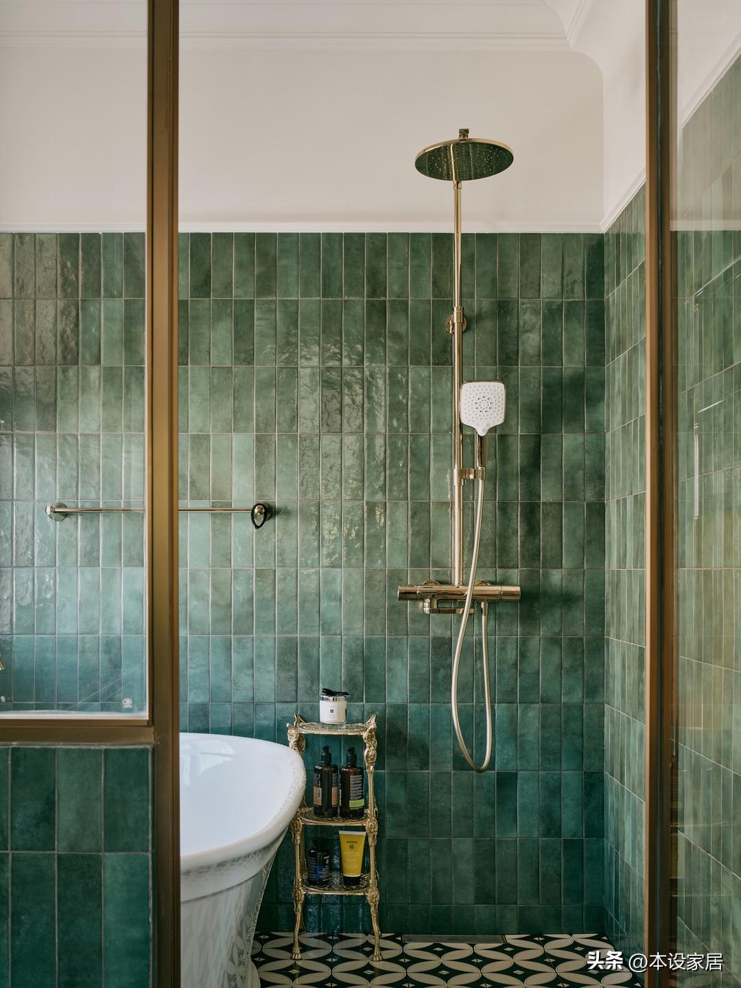 主臥衛生間採用乾溼分離,拼花地磚和綠色牆磚的搭配,在色彩上交相呼應,金色的拱形造型和衛浴用品,呈現出淡淡的復古質感,彷彿在述說着不可忽視的細節之美。