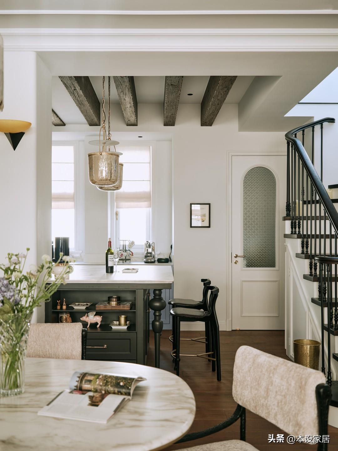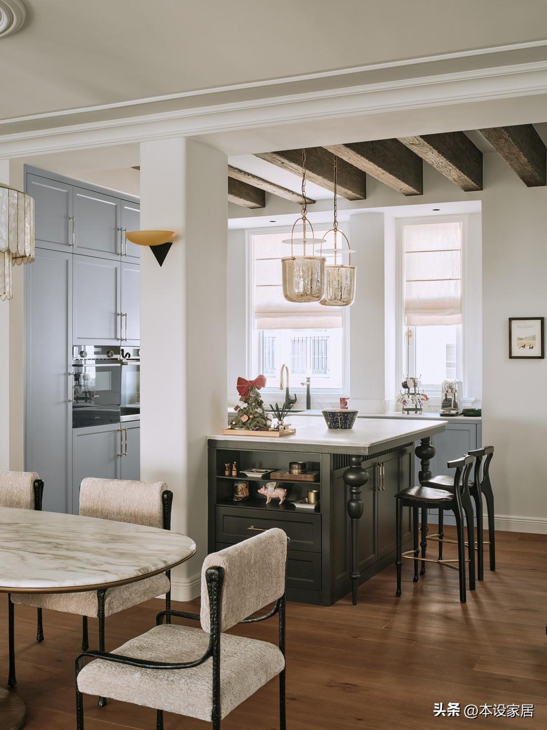拆除原有廚房與餐廳的隔牆後,西廚變得極爲通透,淺藍色櫥櫃的精緻感與木樑的原始感形成強烈對比,在自然光中顯得清新自然,夜色裏又充滿靜謐鬆弛的氛圍,將法式的優雅體現的淋漓盡致。