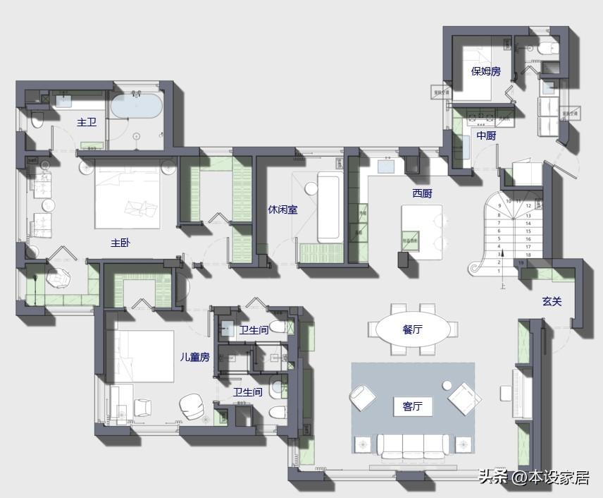 2.主臥和兒童房都打造成爲一個帶獨立衛浴和衣帽間的套房,增加生活便利性。