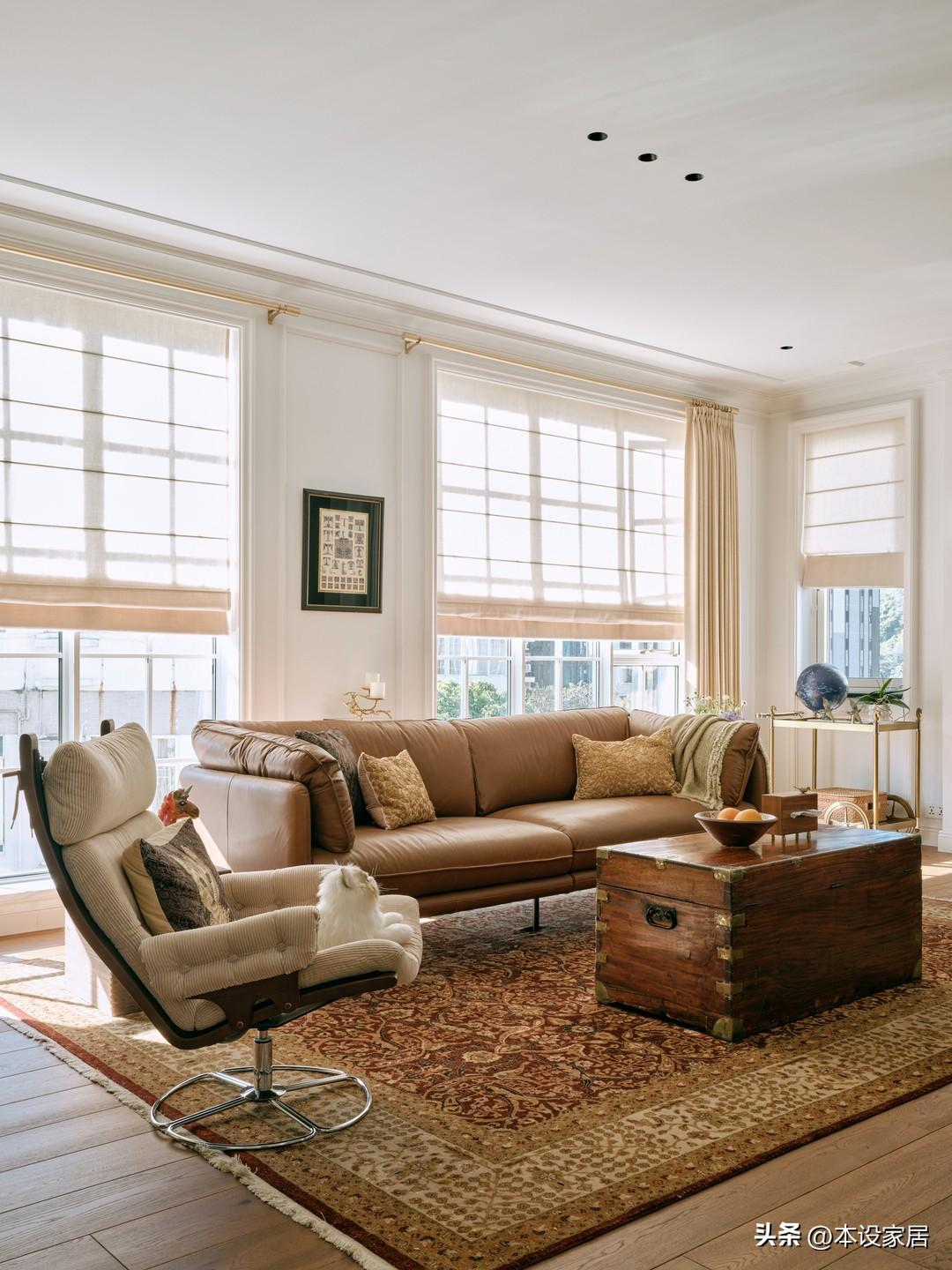 特別要說的是這個當茶几的柚木箱,承載着從英國搬運到香港的記憶,搭配棕色皮質沙發和旅行時淘來的手工地毯,讓整個空間顯得靈動、沉穩,又融合的恰到好處。