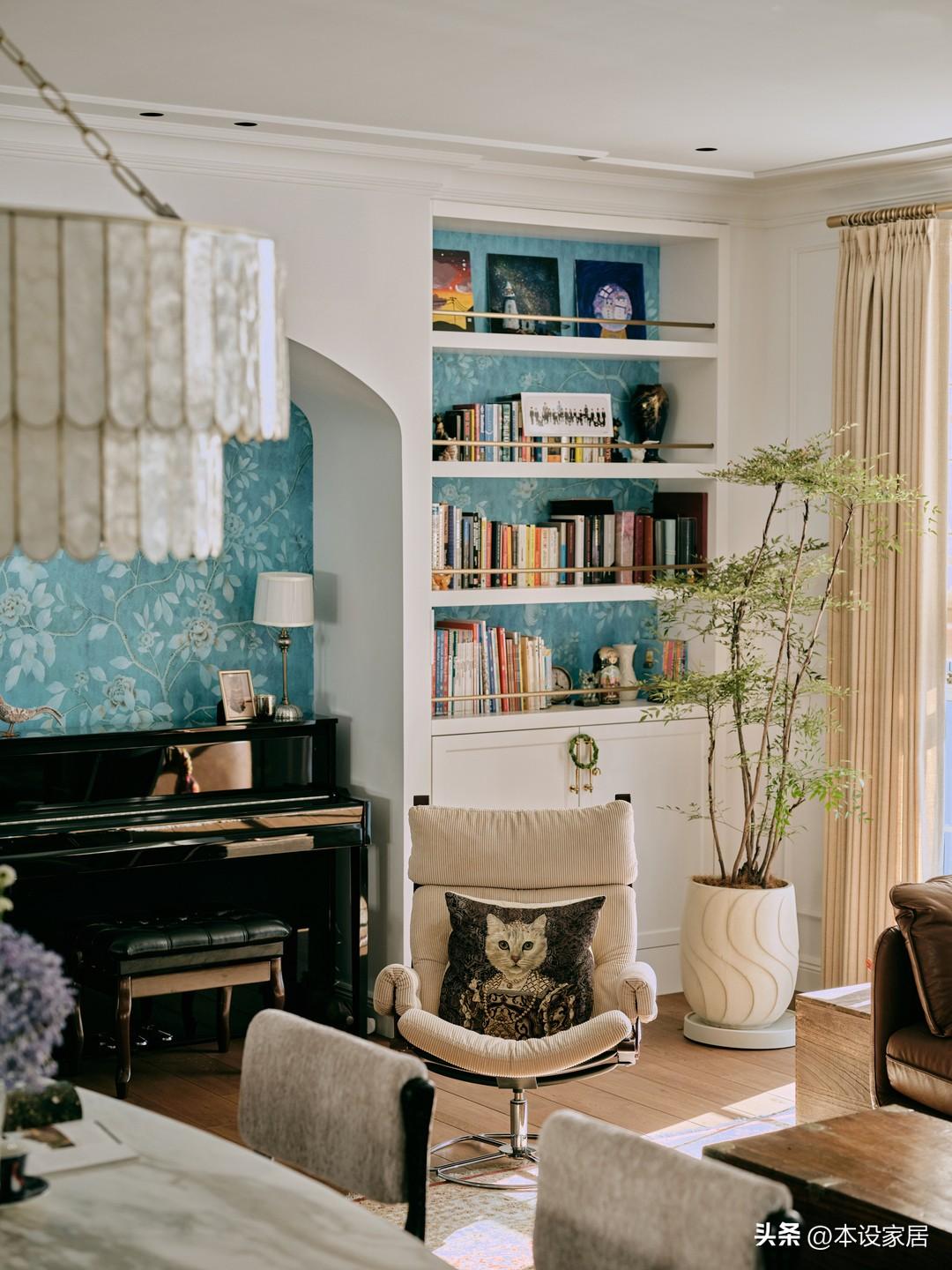 客廳地面鋪設實木地板,摒棄了電視機和背景牆,傢俱採用圍合式佈置,兩邊的牆面則是對稱式的設計,靠玄關處的牆面兩邊是白色的書架,中心巧妙地置入黑色的鋼琴,局部藍色花卉牆紙的點綴,成爲視覺焦點。