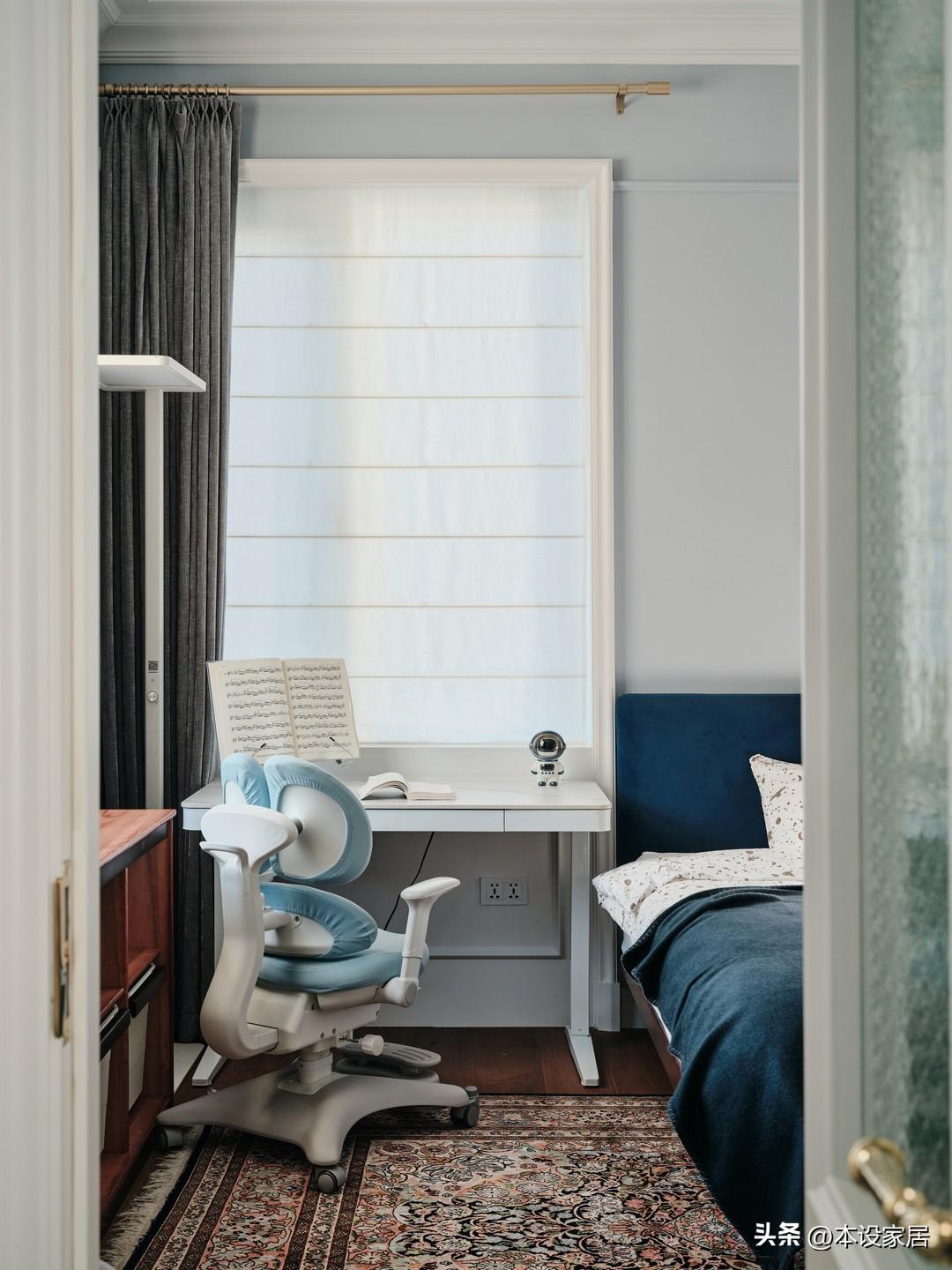 書桌靠窗擺放,側面是裝滿書籍的實木矮櫃,灰色毛絨座椅超可愛,當自然光穿過百葉窗簾,濾出一份柔和的光線,營造了一種安靜而自然的學習氛圍。