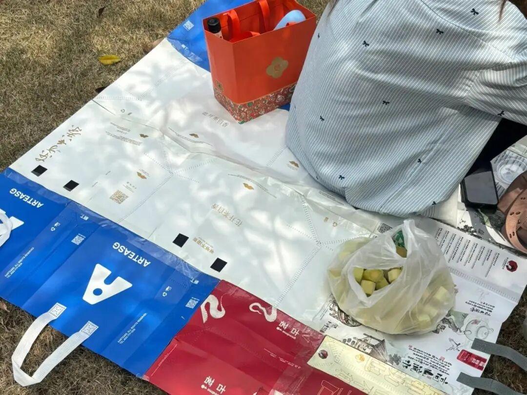 外賣保溫袋作爲地墊使用,輕便也好攜帶,也不佔用空間,還能夠有效隔絕地面寒氣。泡沫層的厚度能夠提供一定的緩衝,坐感也更舒適。