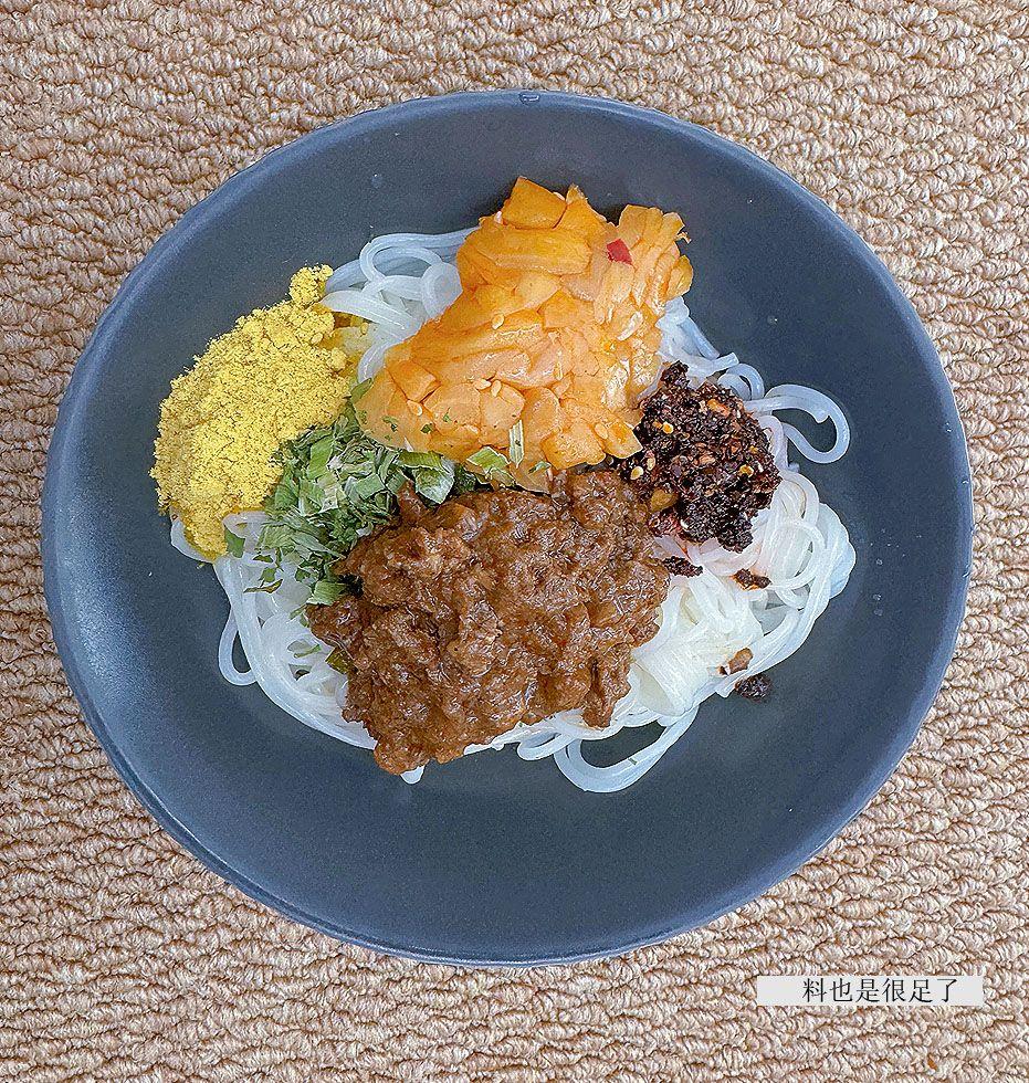 米粉需要水煮,但煮好後過一下涼水,口感會格外Q彈筋道。將所有配料與米粉充分拌勻,每根米粉都裹上醬色和油光,入口先是鹹香,繼而辣味和酸味層層遞進,蘿蔔乾的脆和花生的香穿插其中,口感豐富到爆炸。