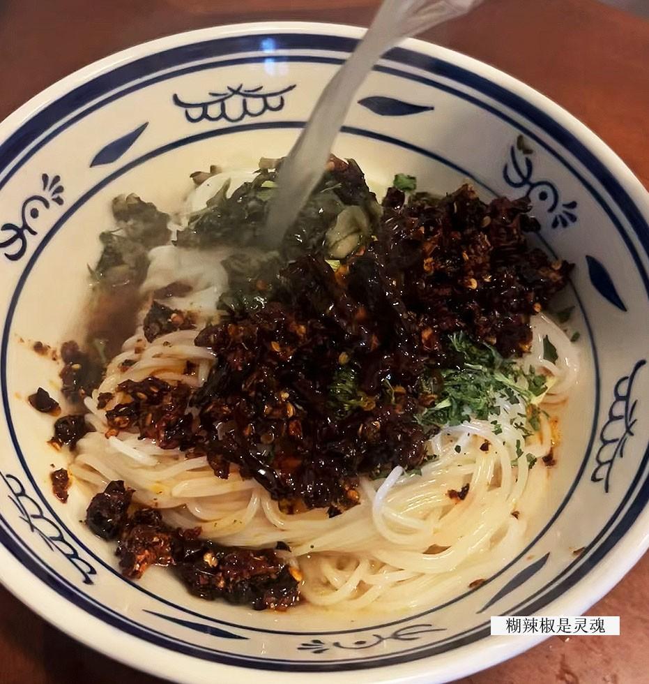 重點在於那包祕製的糊辣椒麪,焦香微辣,根據個人口味撒入湯中,瞬間提香增味。