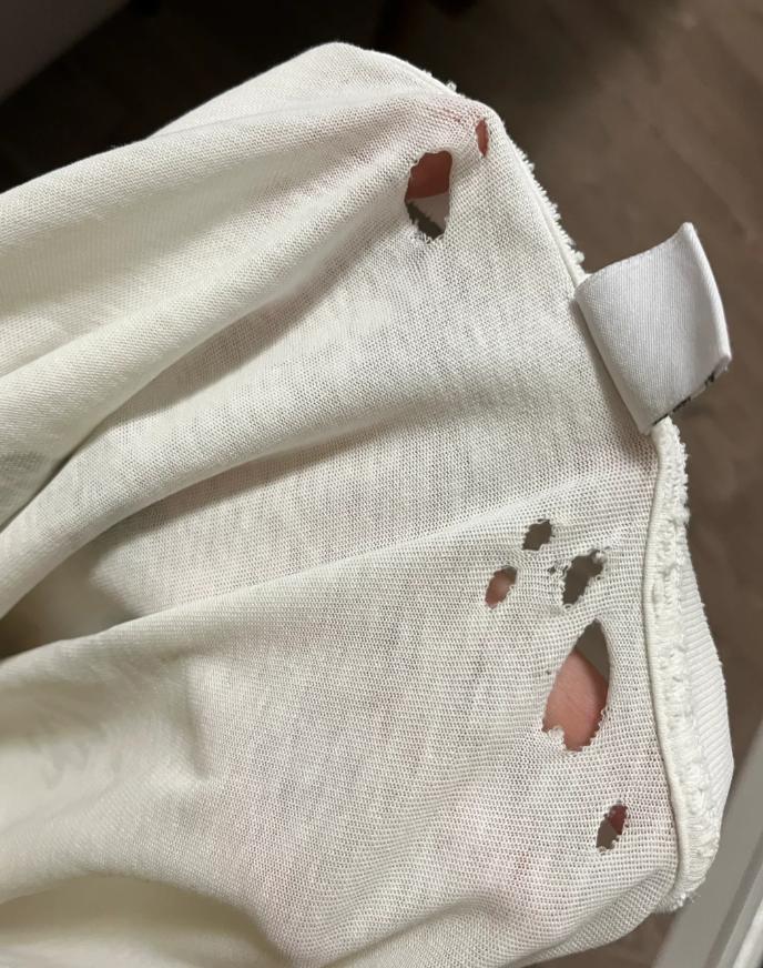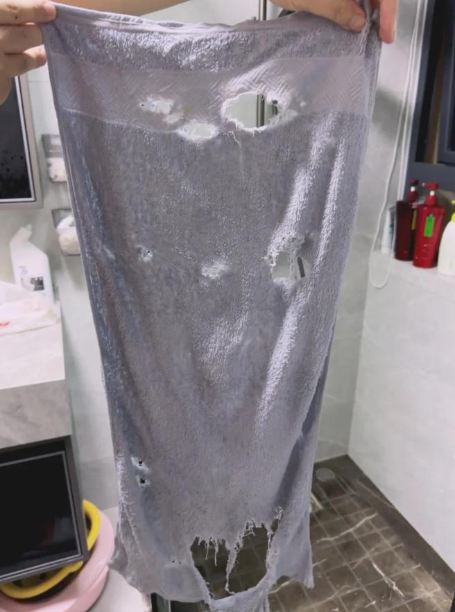 這是我家隊友用了一個月的洗澡毛巾,大大小小七八個破洞,真的很好奇能把毛巾洗成這樣!這是正常的嗎?