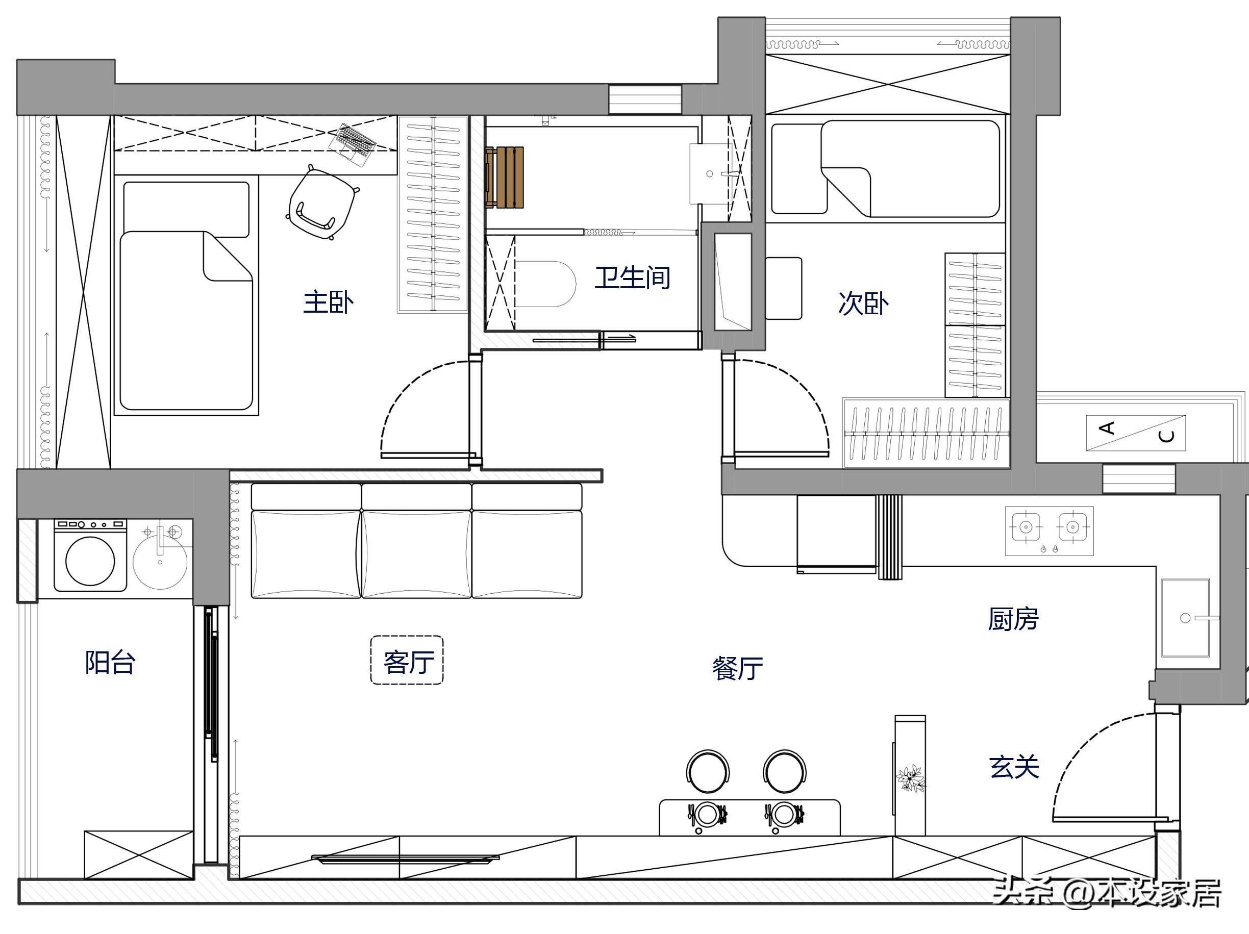 阿姨家是面積約78㎡二居室的戶型,南北朝向,整體佈局圍繞 8個區域+6個功能+4個場景中的安全展開,並拆除原有廚房與玄關的隔牆,讓空間顯得更加寬敞明亮,保證未來使用輪椅時能暢通無阻。