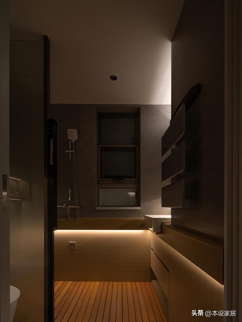 地面鋪設防滑的米黃色瓷磚,牆面原木色飾面,天花刷白色乳膠漆,在暖光燈的烘托下,營造出一個淺色溫馨畫面,也奠定了整個空間的基調。