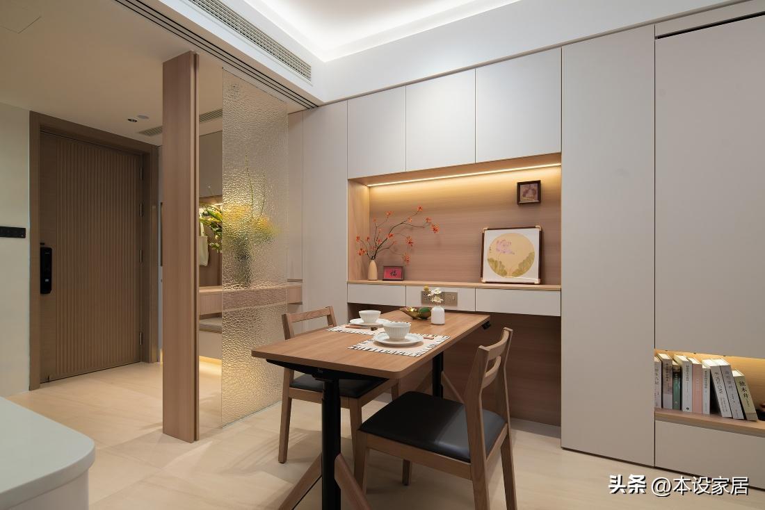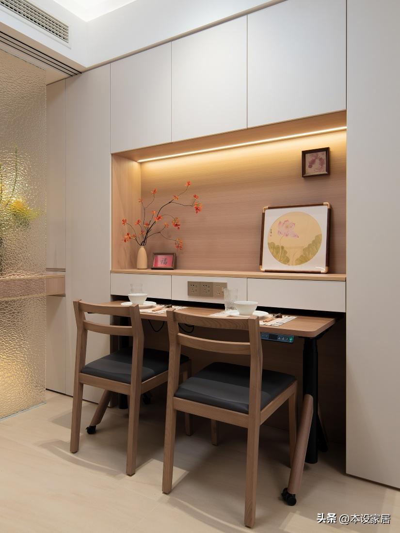 要說這張餐桌,那絕對是爲阿姨量身定製,不僅可摺疊,四邊倒圓角,還可移動和升降,結合餐邊櫃,靈活多變,而充足的照明,讓食物看起來更可口,增加食慾,不得不服。
