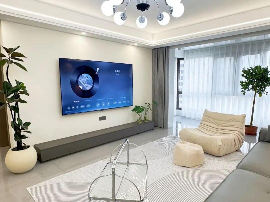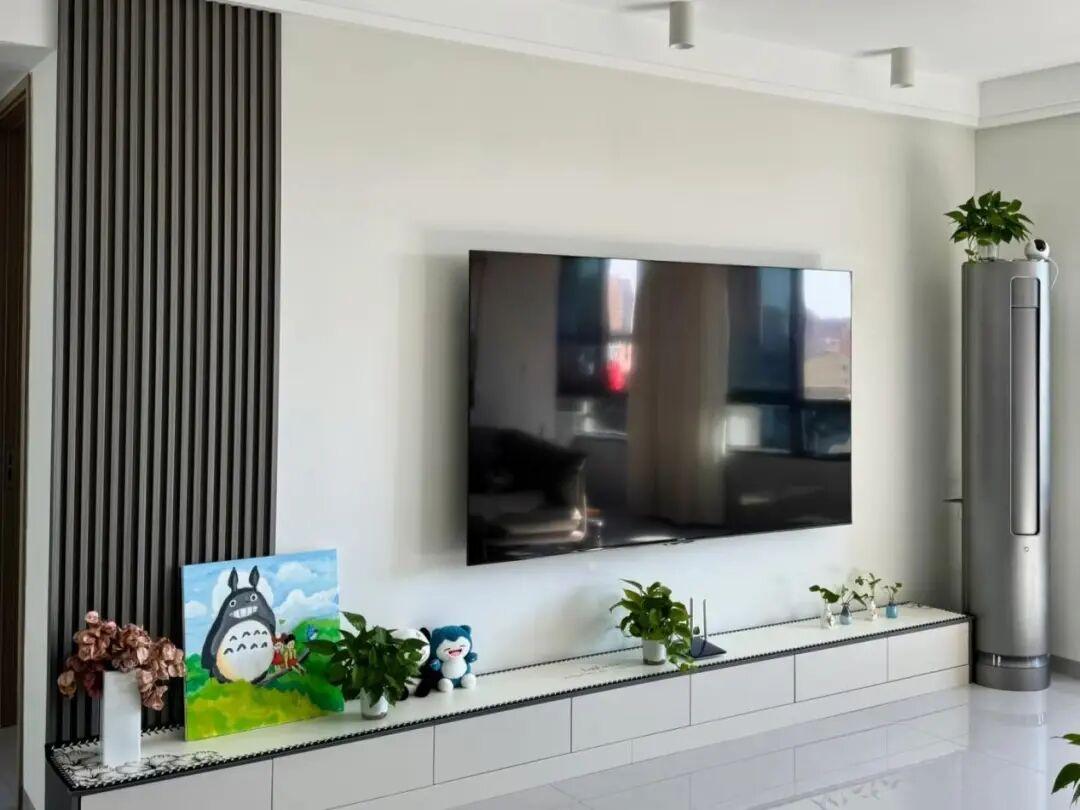 目前比較流行的就是大白牆,搭配投影幕布,簡約又實用,還不容易過時。