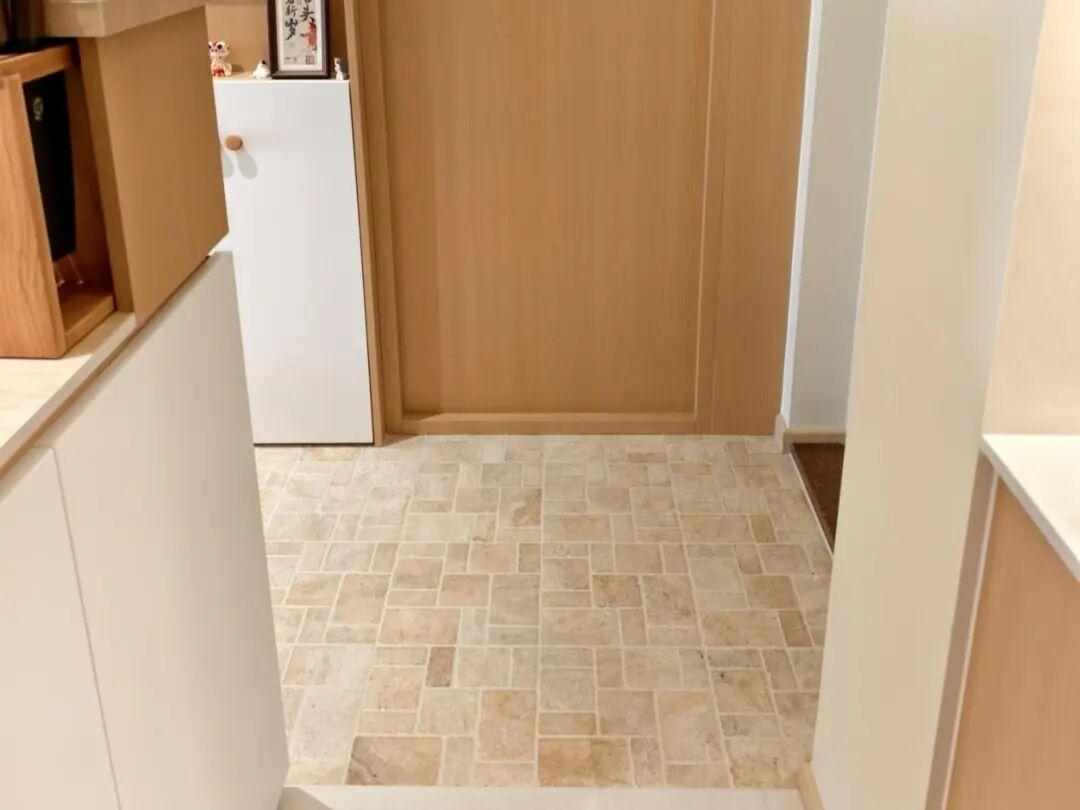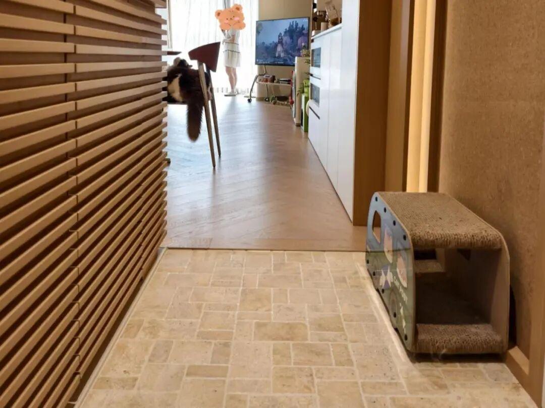 做法是採用一種非常巧妙的方式,通過不同材質的地面,在視覺上劃分出玄關區域。