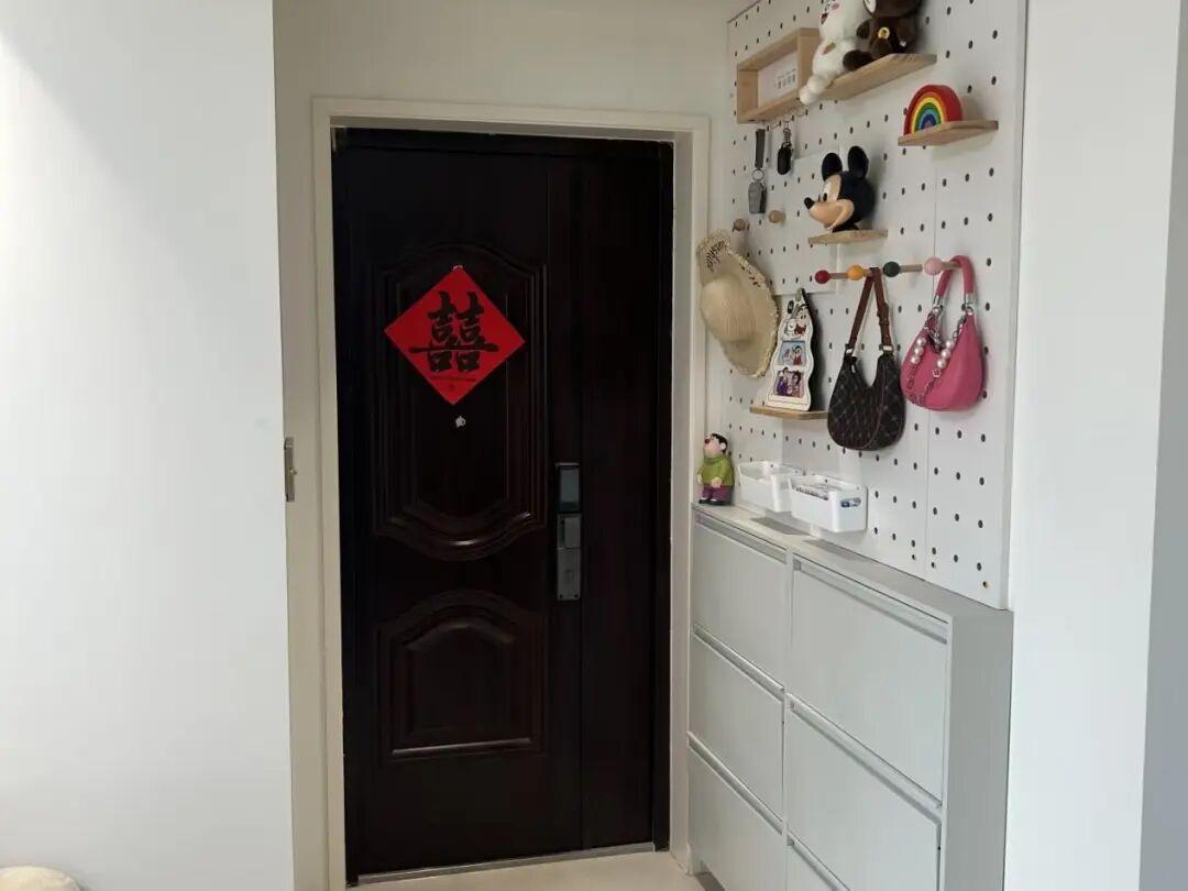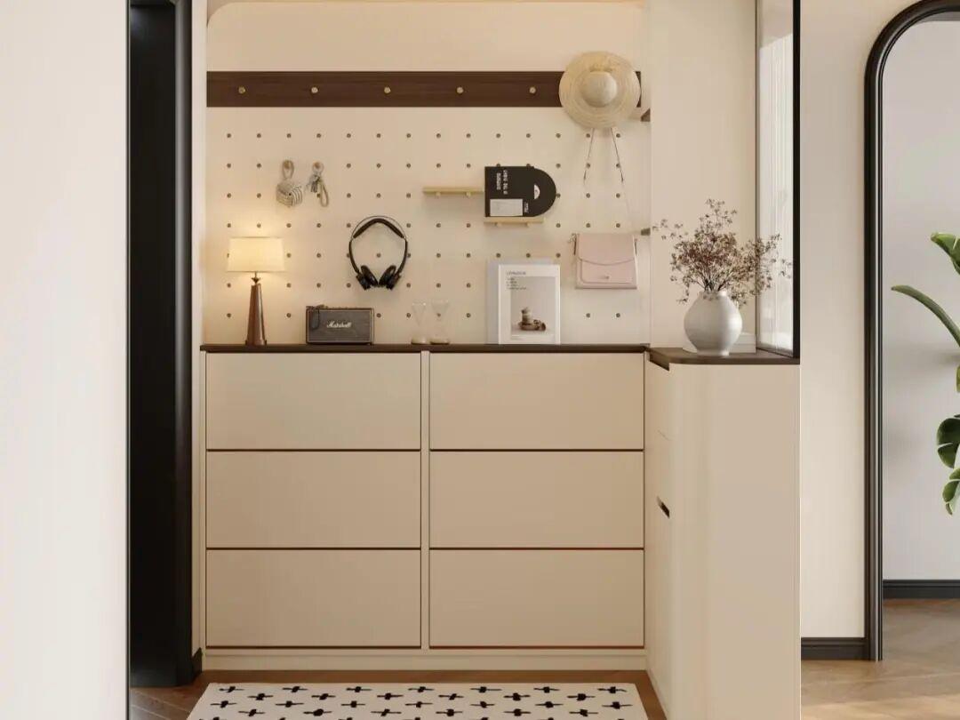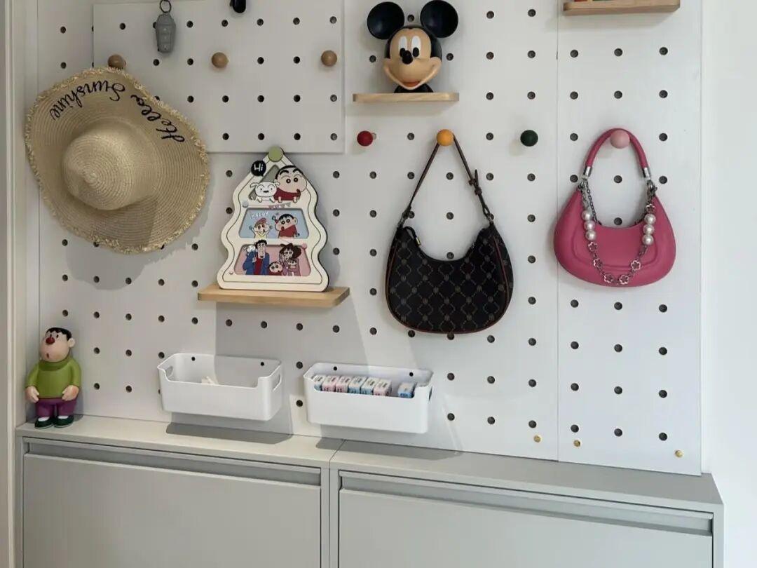 在鞋櫃的上方牆面,可以安裝整面的洞洞板,再搭配配件,就可以實現掛衣、放鑰匙,擺裝飾等各種功能。