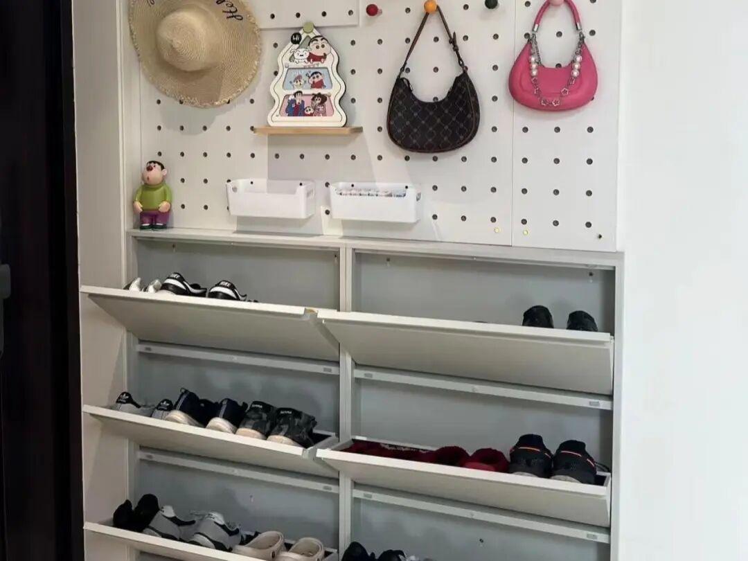 翻鬥鞋櫃配洞洞板,特別適合狹窄的入戶走廊,能夠很大程度節省空間。而且收納能力也很強,能存下10~15雙常穿鞋,洞洞板可能掛好多物品。