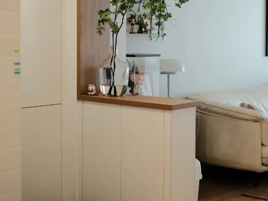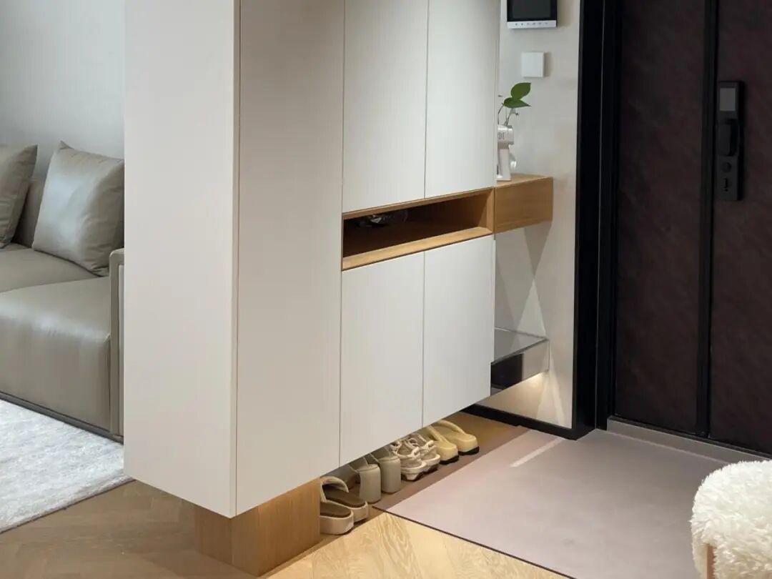 鞋櫃的高度是差不多1.1米左右,正面是朝向了入戶門的方向,用於放鞋。背面朝向了客廳,頂部檯面可以放置一些綠植擺件,成爲沙發背景牆的延伸。