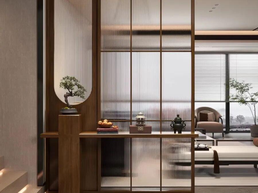 在入戶門的左側,像正對客廳沙發的位置,可以定製一面頂天立地的長虹玻璃隔斷。