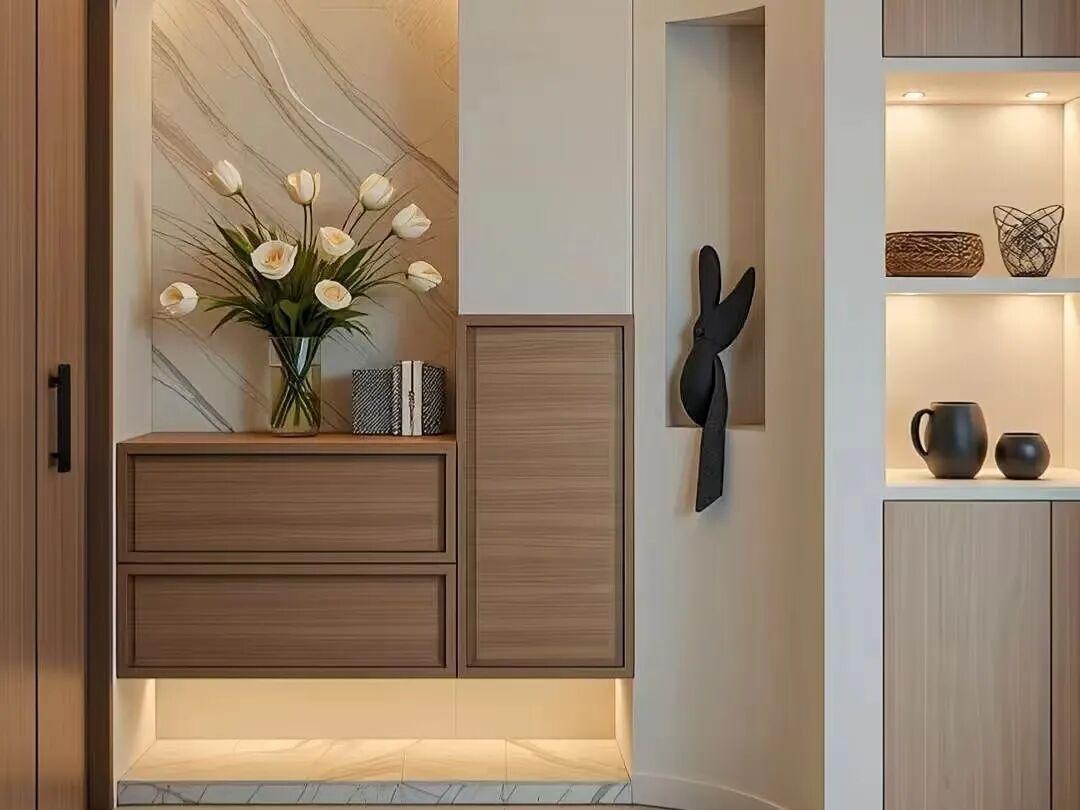 做法就是在入戶門一側的整面牆定製一套懸浮式的收納,包括懸空的抽屜,中部留空的檯面,還有上方的吊櫃。