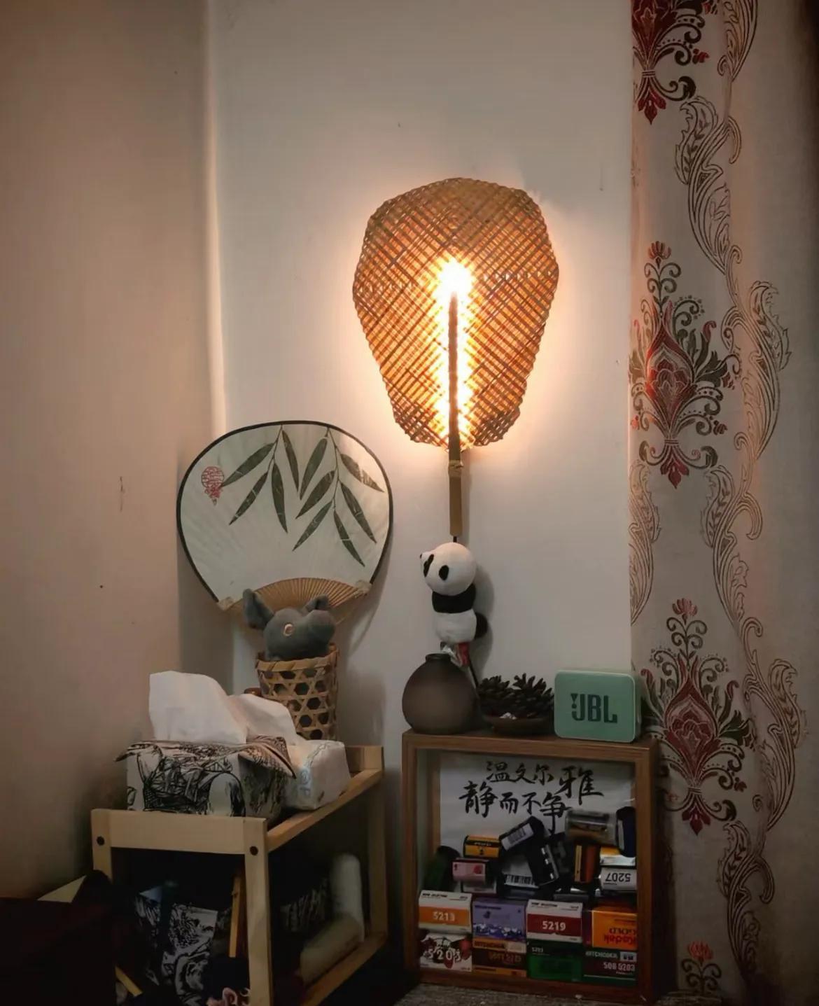 瞧網友@棕棕,就用一把蒲扇,一個充電燈泡,搭配在一起,DIY出一個氛圍感小夜燈。