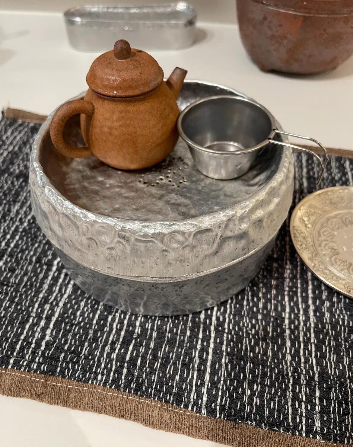 網友@A米,家裏閒置了幾十年的鋁飯盒,突然就來了靈感,挑圓形的變壺承,錘紋完了之後,中間用螺絲刀敲出瀝水孔,和迷你茶壺好好搭,一壺一杯,太完美了!